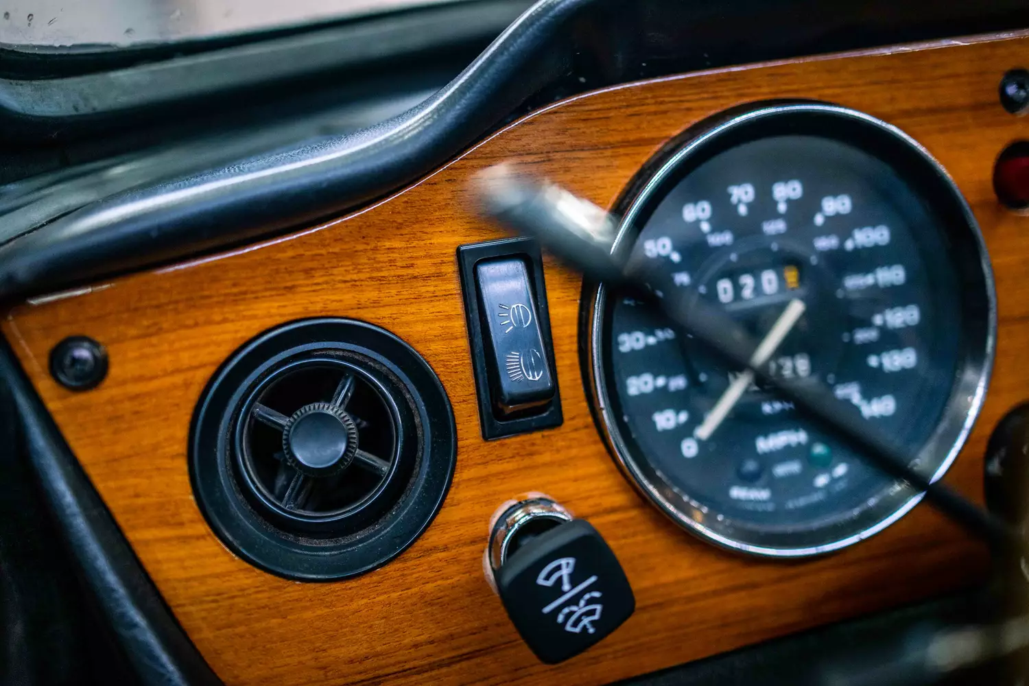 Viel Stil ist im Innenraum zu erwarten: Ein echtes Brett nimmt die Uhrensammlung auf, das Holz zeigt keine Sprünge, das Zündschloss sitzt erwartungsgemäß unter der Lenksäule. Das sportliche, teilweise in Holz ausgeführte Moto Lita Volant ist wie der Schaltknauf nicht beschädigt und befindet sich dementsprechend in sauberem Erhaltungszustand. Die Sitze sind aus schwarzem Vinyl und Stoff, sie zeigen sich rissfrei, an den Türtafeln sind ebenso keine Mängel zu erkennen, der Fußraumteppich weist keine Flecken auf. Die Fenster lassen sich elektrisch betätigen.
