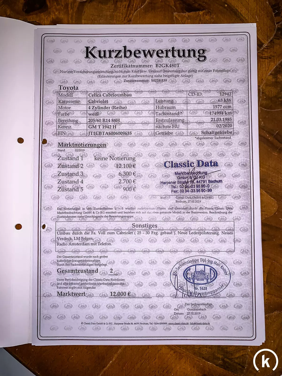 In dieser Auktion wird auf ein Toyota Celica Cabrio aus dem Jahr 1985 geboten. Das Fahrzeug, dass aus einem Coupé TA60 beim Karosseriebauer Voll entstanden ist, besitzt einen hohen Seltenheitswert und befindet sich in einem ausgesprochen guten Erhaltungszustand. Es wurde im März des Herstellungsjahr in Deutschland zum ersten Mal für den Straßenverkehr zugelassen und hat bislang nur zwei Mal den Besitzer gewechselt. Die Historie des angebotenen Toyota Celica ist anhand der beiliegenden Dokumente sehr gut nachvollziehbar, neben Fahrzeugbrief und Scheckheft geben Rechnungen, Gutachten und TÜV-Protokolle über die Aktivitäten der bisherigen Eigentümer Auskunft. Der spritzige Japaner ist fahrbereit und angemeldet, die nächste Vorstellung beim TÜV ist erst im Juli 2024 erforderlich. Das Fahrzeug ist als historisches Fahrzeug anerkannt und verfügt über H-Kennzeichen, die vermutete Übereinstimmung der Matching Numbers sollte noch einmal verifiziert werden. Das zum Vollcabrio umgebaute Fahrzeug mit der ID JT1CBTA6006009635 ist bis zum heutigen Tag unfallfrei geblieben und wird mit 3 Schlüsselsets an den zukünftigen Besitzer übergeben.