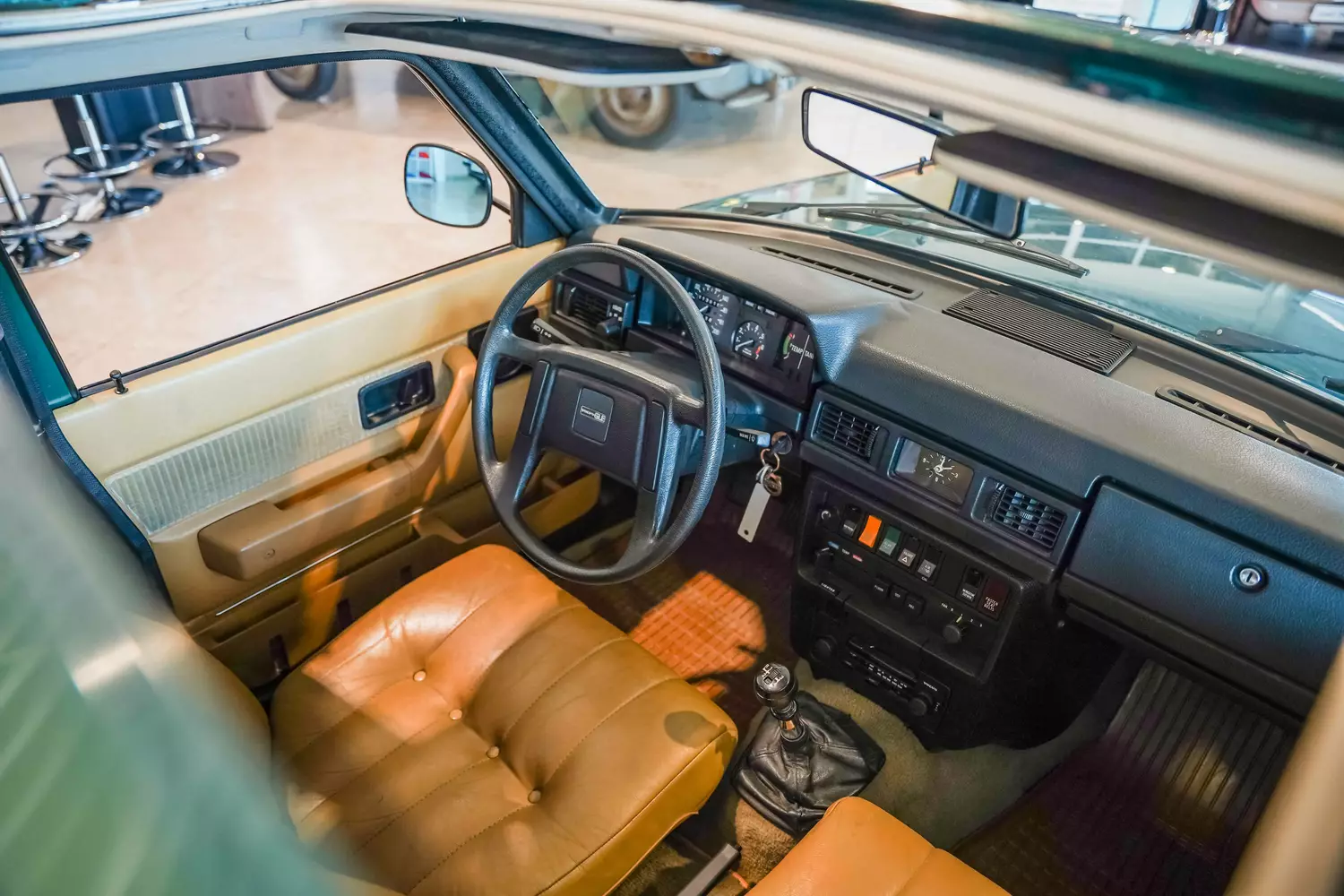 Kantig im Design zeigt sich der Volvo auch im Innenraum: Hier setzt sich die eckige Linienführung von außen weiter. Die Innenausstattung zeigt sich mit leichter Patina überzogen. Die beigen Vollledersitze sind völlig intakt und sorgen für guten Komfort, nur die äußere Seitenwange des Fahrersitzes zeigt sich etwas beansprucht – Ansonsten sind dem Interieur keine Verschleißspuren oder Beschädigungen zu entnehmen. Im Jahr 2017 wurden diverse Schalter und die Türkontakte erneuert und der gesamte Innenraum wurde einer detailreichen Reinigung unterzogen. Aufgrund der GLE Ausstattung befinden sich neben der Lederausstattung folgende Merkmale an Bord des 244: Schiebedach, elektrische Fensterheber vorne, Scheinwerfer-Reinigungsanlage und ein zeitgenössisches Volvo-Kassettenradio.