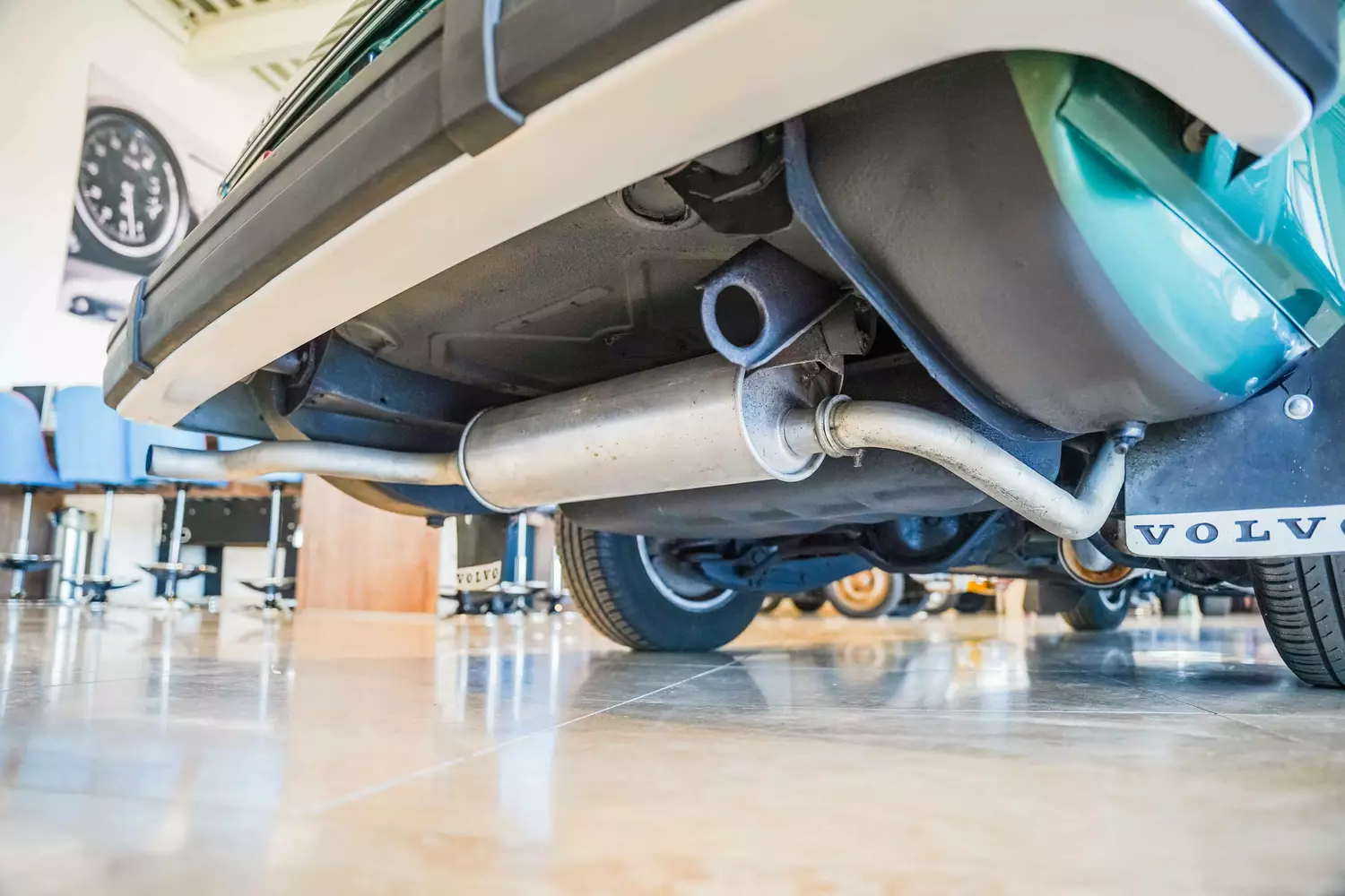 Der Unterboden sowie die Radhausschalen sind in einer tadellosen Verfassung, 2019 wurde auf der Unterseite des Volvo 244 GLE eine neue Abgasanlage verbaut.