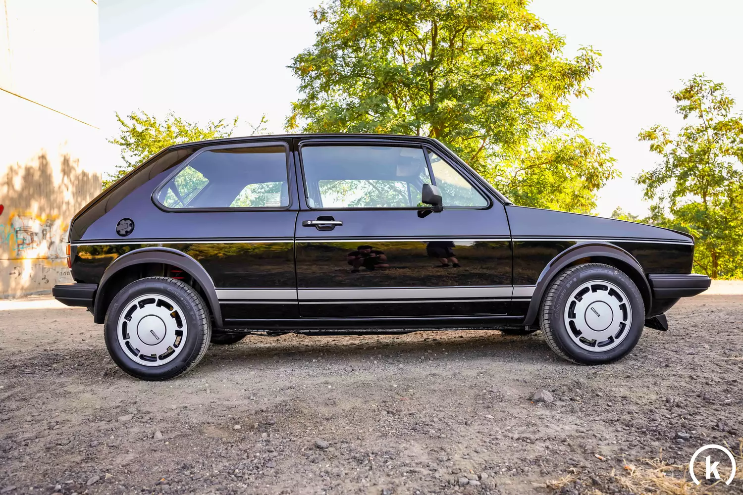 Der schwarze Golf 1 GTI nutz zur Fortbewegung die originalen, namensgebenden Pirelli-Leichtmetallfelgen, auf die selbstverständlich die passenden Pirelli Cinturato Reifen aufgezogen sind. Beide Komponenten befinden sich in einem sehr guten Zustand, ebenso sind die erneuerten Bremsen voll funktionstüchtig. An der Konstruktion des Fahrzeuges wurde seit der Auslieferung nichts verändert, ebenso konnten bei der Begutachtung des dynamischen Golf GTI keine Mängel festgestellt werden.