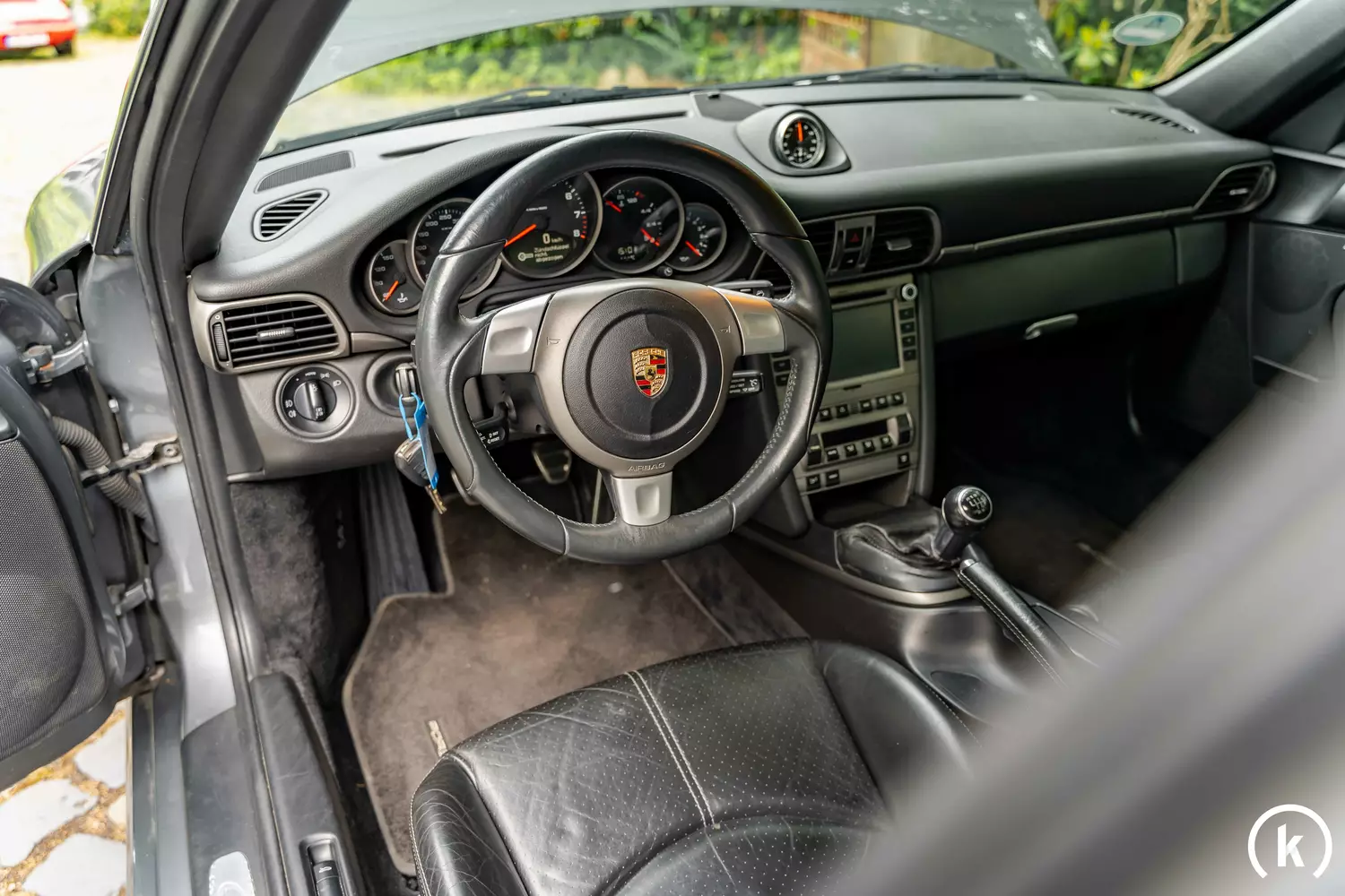 Im Vergleich zum Vorgänger 996 wurde das Innere des 997 deutlich überarbeitet, vor allem die Wertigkeit im Interieur wurde verbessert. Bis auf leichte Patina an den schwarzen Vollledersitzen und an einer Taste in der Mittelkonsole kann dem Innenraumzustand ein gutes Befinden ohne Schäden oder Fehlteile entnommen werden. Neben einem elektrischen Schiebedach und dem 3-Speichen Sportlederlenkrad verfügt dieser Sportwagen zudem über eine elektrische Sitzverstellung, Sitzheizung, Klimaanlage und ein Porsche Radio mit integriertem Navi. Allen Ausstattungselementen kann eine einwandfreie Funktion zugesprochen werden.