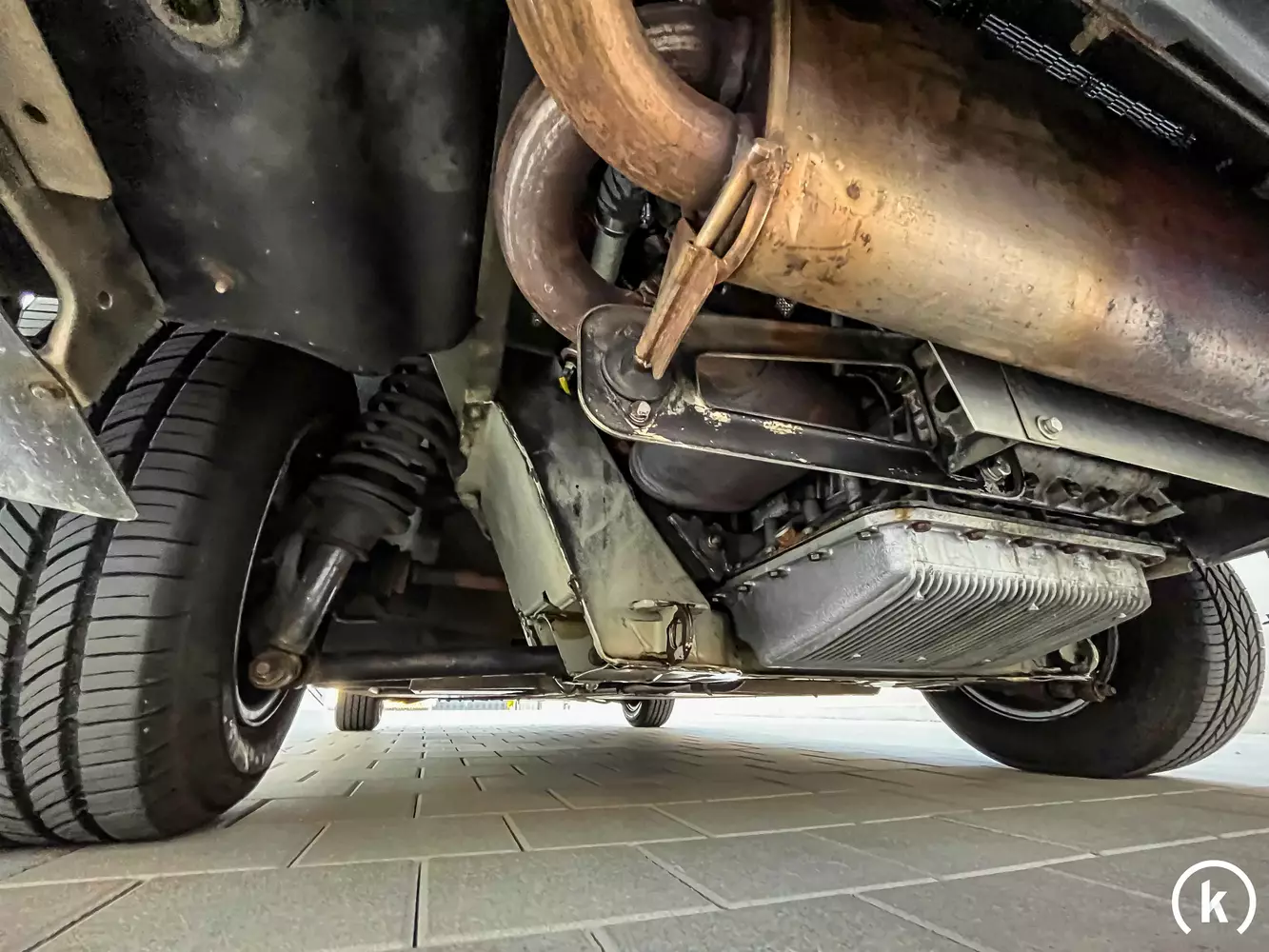 Auf den DeLorean Originalfelgen im Mehrspeichen-Design sind Reifen in laut Verkäuferangaben gutem Zustand aufgezogen. Komplett revidiert wurden die Bremsen, weshalb diese keinerlei Defizite aufweisen. Die Einzelradaufhängung – vorne an oberen Dreiecksquerlenkern und unteren Querlenkern sowie hinten an Schräg- und Querlenkern – weist augenscheinlich keine Mängel auf.