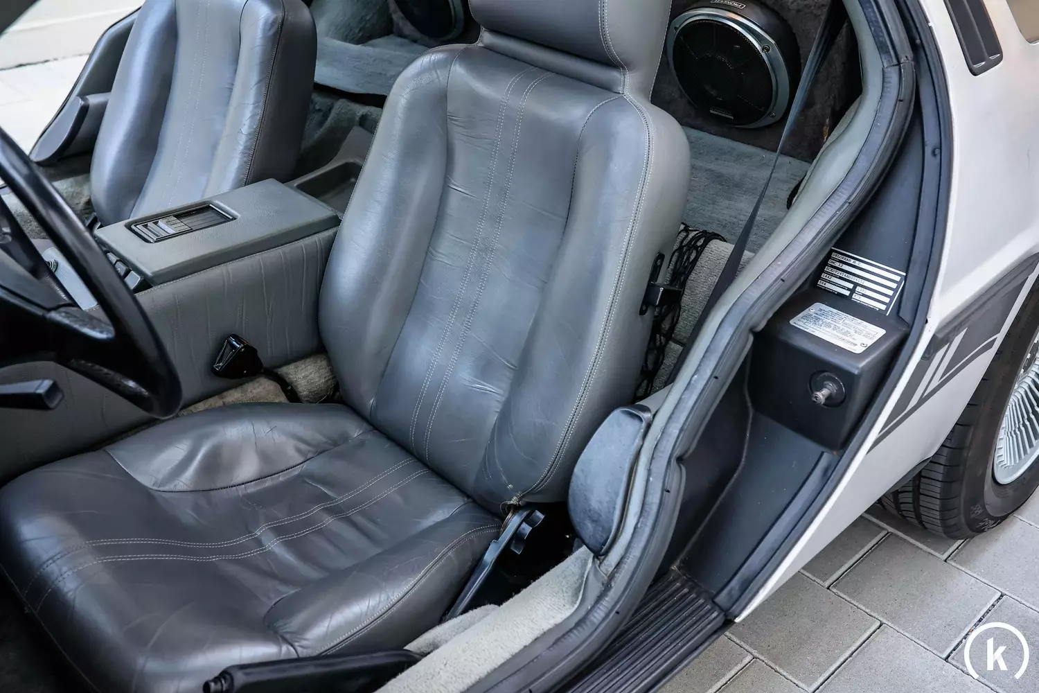 Eine tiefe Sitzposition erwartet den Fahrer und Beifahrer sobald man die Flügeltüren geöffnet hat: Im Interieur des DMC-12 ist die Farbe Grau sehr präsent. Dem Vollleder-Fahrersitz ist etwas Patina anzusehen und der Fußraumteppich weist ein paar Farbunterschiede auf, ansonsten können dem Innenraum bis auf ein paar minimale Gebrauchsspuren keinerlei Beschädigungen oder gar Fehlteile entnommen werden. Das 3-Speichen Lederlenkrad präsentiert sich genauso wie der Lederschaltknauf in gutem Erhaltungszustand. Ausstattungsmäßig an Bord des DeLorean sind: Zentralverriegelung, elektrische Fensterheber, Klimaanlage, ABS und ein Radio.