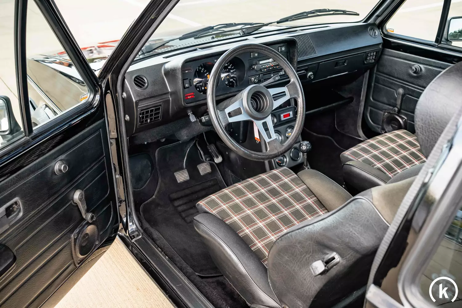 Im Innenraum des VW Golf 1 GTI sind schwarze Sitze mit grauem Stoffbezug verbaut, die perfekt mit der Außenlackierung harmonieren. Allgemein dominieren dunkle Farben die Fahrzeugkabine und wurden sowohl an den Innenseiten der Türen als auch im Fußraum verwendet. Die Armaturentafel ist klassisch gestaltet und weist wie das übrige Interieur nur geringe Gebrauchsspuren auf, dabei verleiht das Lenkrad im Spucknapfdesign dem Golf 1 zusätzliche Authentizität. Die Ausstattung des Fahrzeuges ist wie für den GTI Ur-Typ damals üblich eher spartanisch, einzig ein Radio sorgt für Unterhaltung und zusätzlichen Reisekomfort.