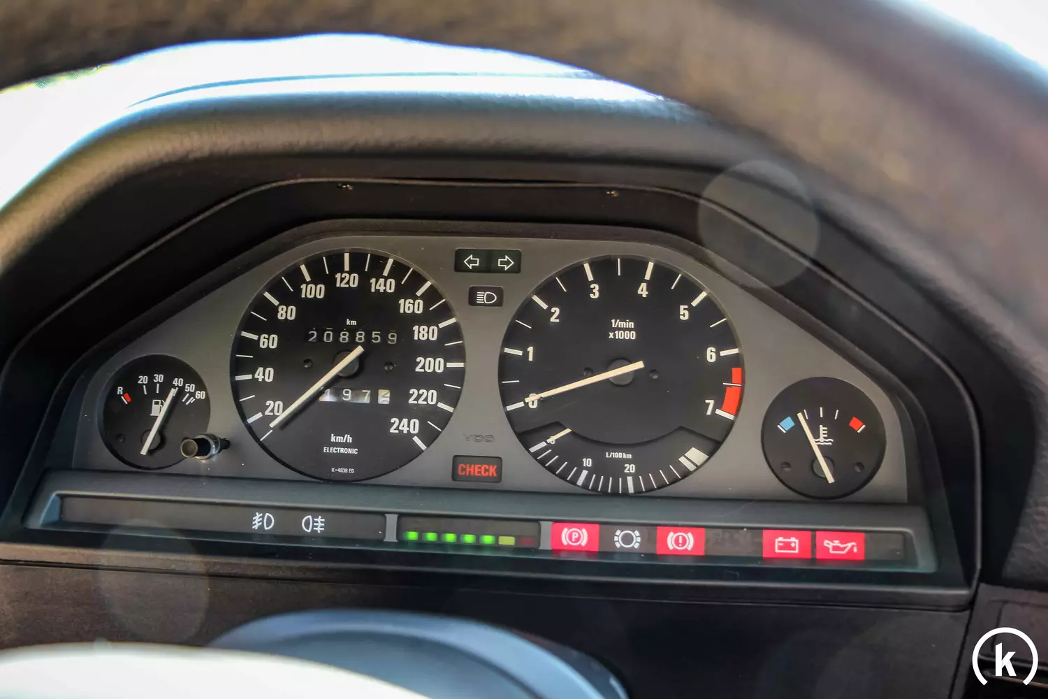 The speedometer has a mileage of about 208,000 kilometers. A partially kept checkbook is available as well as various older invoices and earlier TÜV reports. All displays in the instrument cluster work perfectly.