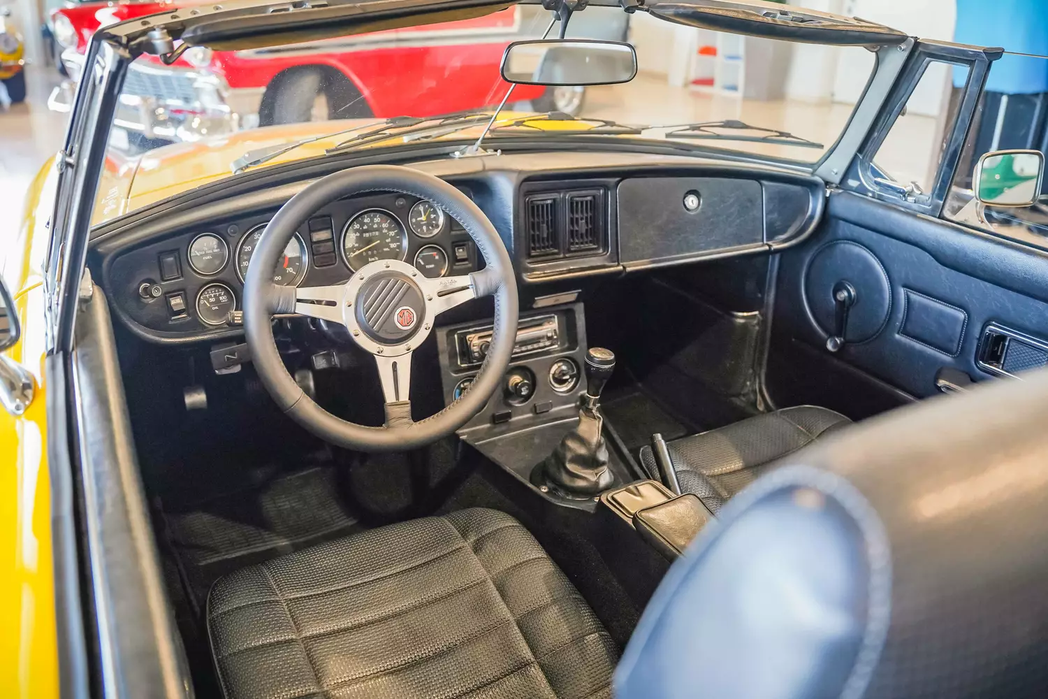 The body colour of the MGB Roadster is bright yellow: the exact colour is called "Inca yellow". The seller mentions that minor dents and scratches that have accumulated on the exterior over the years have prompted him to completely disassemble the MGB and repaint it in its original color. In the course of assembly, all seals were renewed. Now this British roadster is in very good condition without damage. The chrome and the trim elements around the body are completely present, the black soft top is just as crack-free as the plastic rear windows. An accident excludes the current owner in his possession.