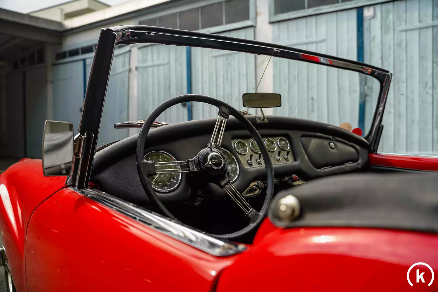 Unfortunately, due to an accident, the front of the Daimler SP 250 was partially damaged by a reversing car, which can be viewed in detail on the telling photo gallery. This shows that the GRP body at the front has broken off and cracked in some places. Actually, the rest of the condition of the body is quite neatly preserved, as restoration work also took place in terms of body technology and the paint of the Daimler was completely renewed in red in 1981. The black folding top is preserved in a damage-free condition.