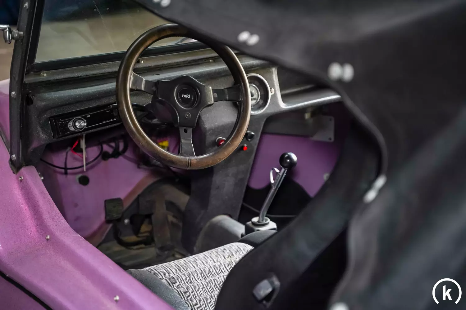 The VW Buggy has the typical simple equipment inside. On the well-preserved dashboard, in addition to the steering wheel, controls and speedometer, a radio can be found, the boxes installed in the rear provide the extra portion of good mood. Folding sports seats of a Porsche 924 were used, which are covered with black imitation leather and checked fabric and are in good general condition. A tailor-made vinyl roof in dark grey protects against sudden rain. Piping rails and snap fasteners are available for fastening, and there are also button-in doors whose vinyl window panes allow a clear view.