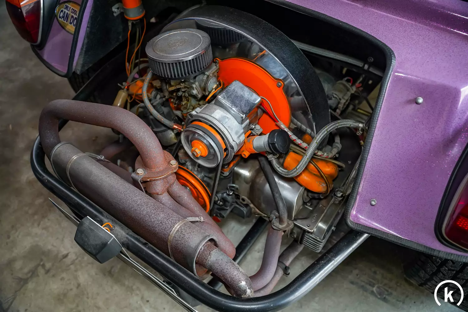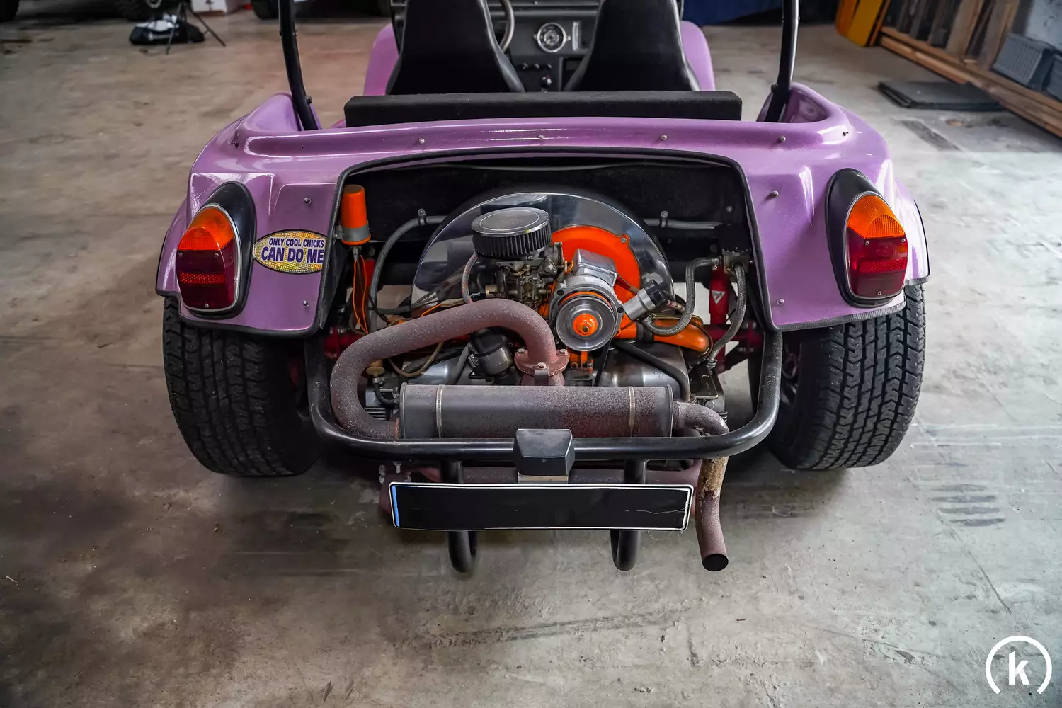 The vehicle is equipped with a VW Beetle-based engine, which probably comes from a Formula V car of the early 1970s. The 1.6 liter machine was provided like other parts of VW Classics, the missing stamp, the special 4-speed transmission and the steel plate in the area of the front axle at least suggest the assumption of an earlier racing use. The vehicle also delivers the usual 65-70 hp at the time, the top speed should be about 150km/h due to the low weight. Damage to the engine and the technology could not be detected during the last service, apart from some corrosion discoloration, the underbody is in good condition.