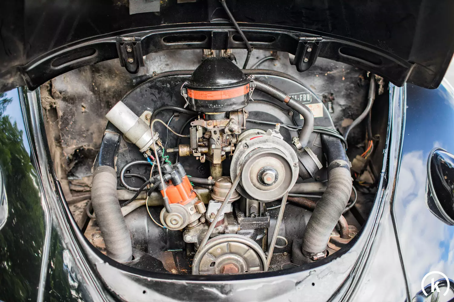 Das ist definitiv ein Motor nach 1973. Drehstromlichtmaschine mit 12 Volt, dadurch musste das Fzg auf 12 Volt umgerüstet werden. Vergaser mit Abschaltventil (mit VAG und Audi Zeichen ) und mit Unterdruckabgang (Blind gemacht) für die Ansaugluftvorwärmung in Verbindung mit dem dazugehörigen Kunststoff Luftfiltergehäuse (nicht vorhanden, es wurde der alte Ölbadluftfilter verbaut). Der Motor ist nicht original dazugehörig. Das hätte aber der Spezialist sogar ohne große Fachkenntnisse erkennen können.