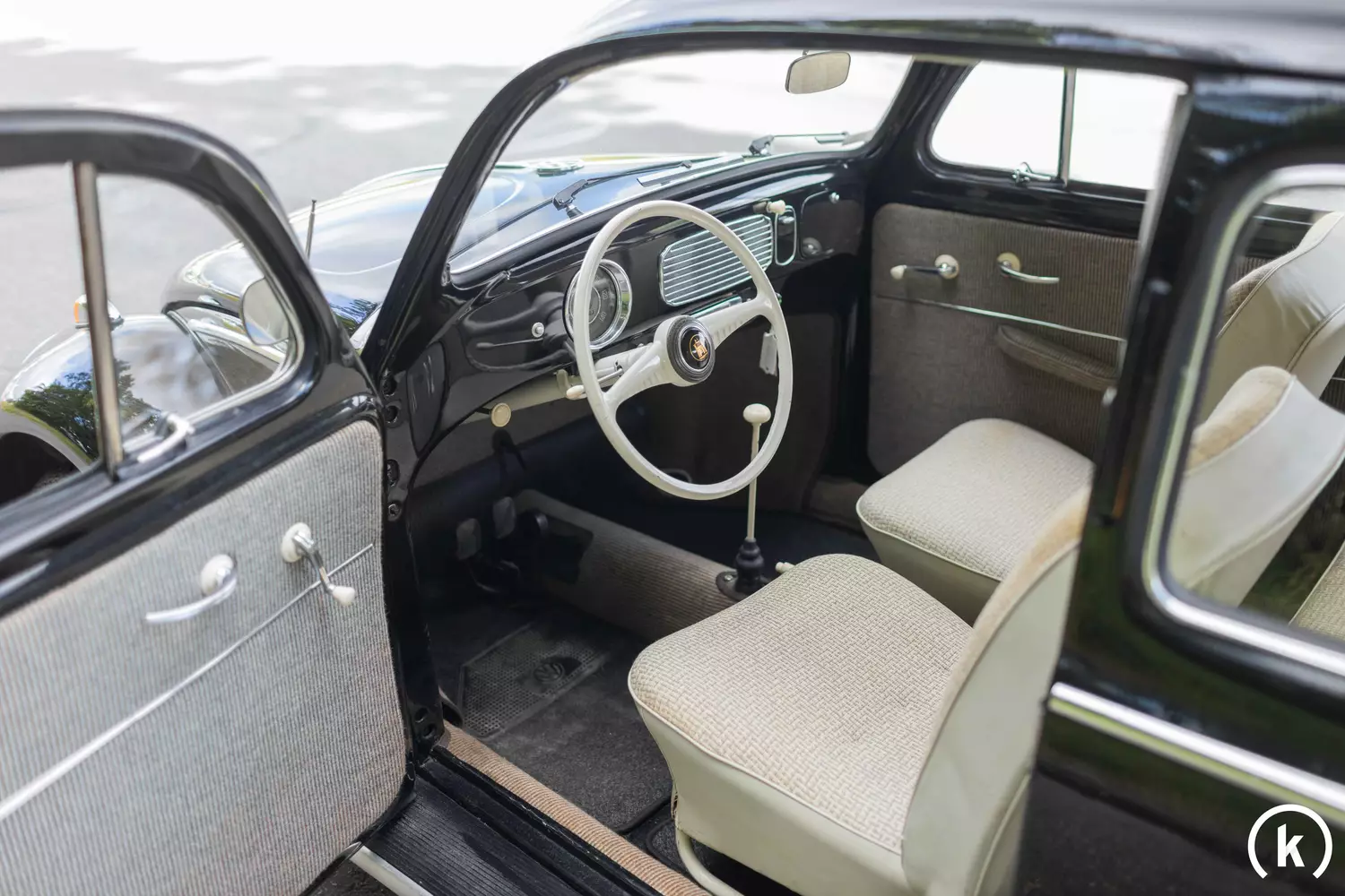 The air-cooled four-cylinder boxer engine in the rear of the Beetle delivers 36 hp, with a displacement of 1.2 litres, it can glide through the area in a relaxed manner – shifting is done by means of a 4-speed manual transmission. In 2022, the Ovali underwent a final service – also in 2022, a general review was carried out, in which no technical defects could be found. On the underbody side, this VW Beetle from 1955 can be attested to a good condition. The Beetle is a vehicle for purists, where there is nothing that you don't really need as a driver. With a fresh inspection and the overall very good condition of this Ovali Beetle with DeLuxe equipment for the vehicle age of now 67 years, the future owner secures a piece of important German automotive history