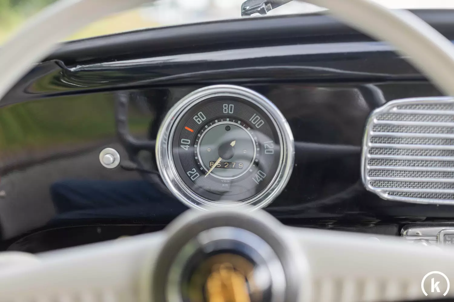 The interior of the VW Beetle in DeLuxe version from 1955 is sparse and limited to the bare essentials: Except for grey fabric seats, fabric door panels, a white 2-spoke steering wheel, window cranks and door handles made of chrome as well as a white control stick and a radio with a large loudspeaker in the middle of the dashboard, there is not much in the interior of the Beetle. But everything that exists also has a function. Over the years, the vehicle has been converted from 6V to 12V.