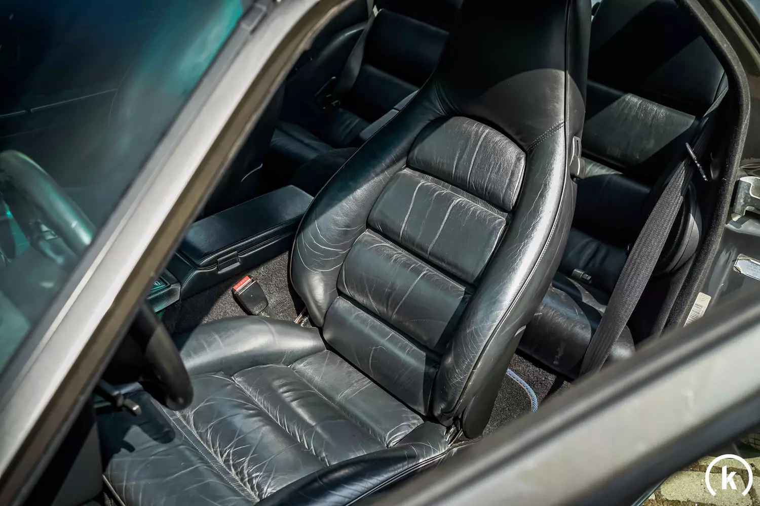 Visually, the 928 GTS in "slate metallic" (color code Q9Q9) convinces against the advanced overall mileage due to its very good body condition for the age of the vehicle. It can be assumed that partial minor beauty touch-ups have been made. The headlights as well as the windows on the vehicle must be attested to a crack-free condition. Parking bumps on the front or rear bumper cannot be identified – the seller excludes an accident with this vehicle in its holding period.