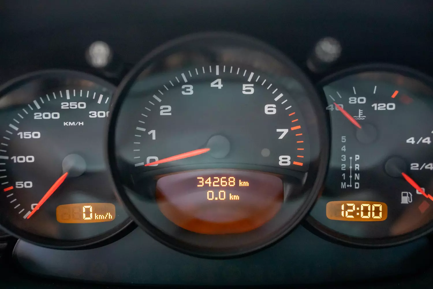 If you look at the clearly structured, easy-to-read fittings with black dials, the electronic speedometer shows a mileage of only 34,268 kilometres. The total mileage can be proven by a flawlessly managed Porsche checkbook. The instruments in the interior can be attested to a perfect function.