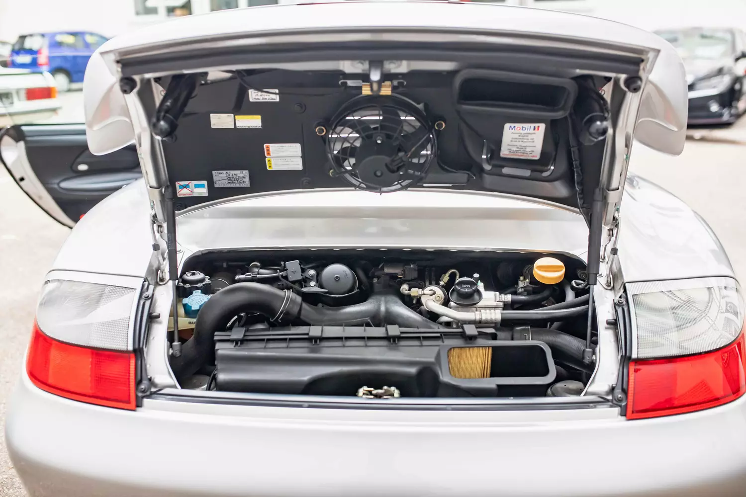 Only minor signs of wear can be found on the paint dress of the "Arctic Silver Metallic" 911 Turbo according to the age. Modifications deviating from the original condition are not to be found on the exterior, the typical turbo folklore includes wide jaws, large air openings and the extendable rear spoiler. Since the delivery of this 996, the vehicle has not been repainted according to the seller, so it still impresses with its extremely well-preserved first paint all around. On the front spoiler as well as on the rear spoiler no traces of a parking bumper can be seen. Corrosion also at the neuralgic zones does not seem to be present anywhere in this Porsche 911, on the whole the body presents itself in a clean condition according to the low mileage.