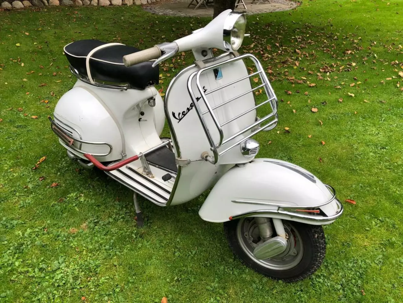 The sleek Vespa has a historic exterior. The original paint finish has been preserved in white and shows the typical patina created over decades. There are no dents or dents, traces of use and signs of corrosion are minimal. Only minor modifications were made to the body, including the integration of Ulma footrests and luggage racks.