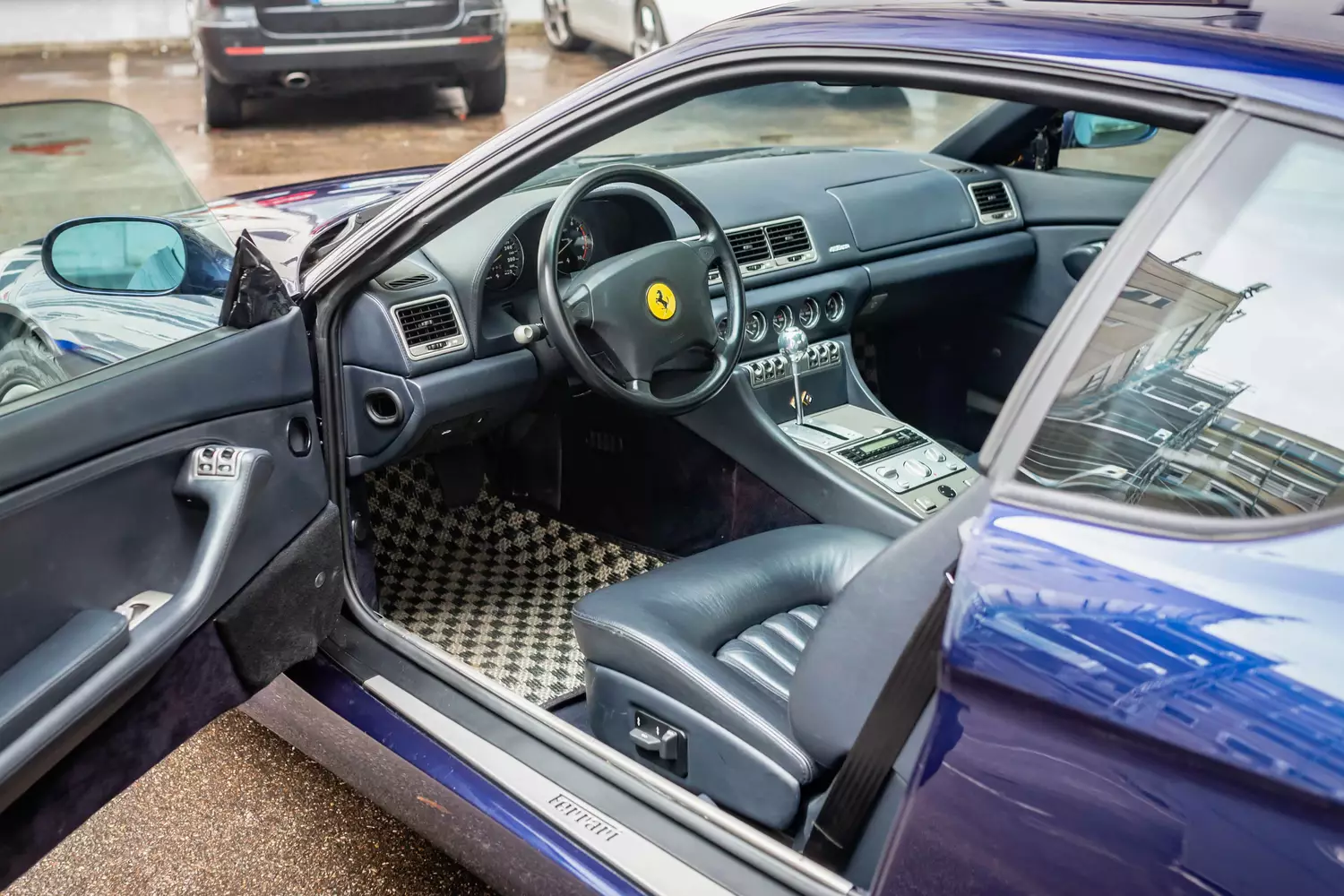 The blue metallic body presents itself accident-free: External defects as well as modifications to the body are apparently not present. The paint condition corresponds to the age and mileage of the 456 GTA, the Ferrari has not yet been repainted after consultation with the seller, so there is still the first paint on the vehicle. Four tailpipes provide grandeur, the rear bumper as well as the front bumper has no parking bumps. Traces of corrosion on the entire body are not present. The headlights are free of scratches and the windows show no traces of damage.