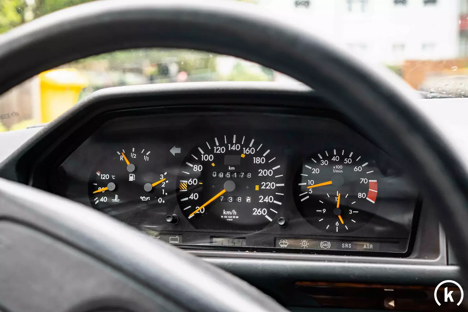 The instruments in the speedometer of the W124 are clearly legible: On the 6-digit odometer of this cabriolet, a mileage of 95,180 kilometers can be read – the total mileage can be proven via partially guided checkbook and various existing documents, according to the seller's statements. All displays and controls in the interior of the convertible are in service without any problems.