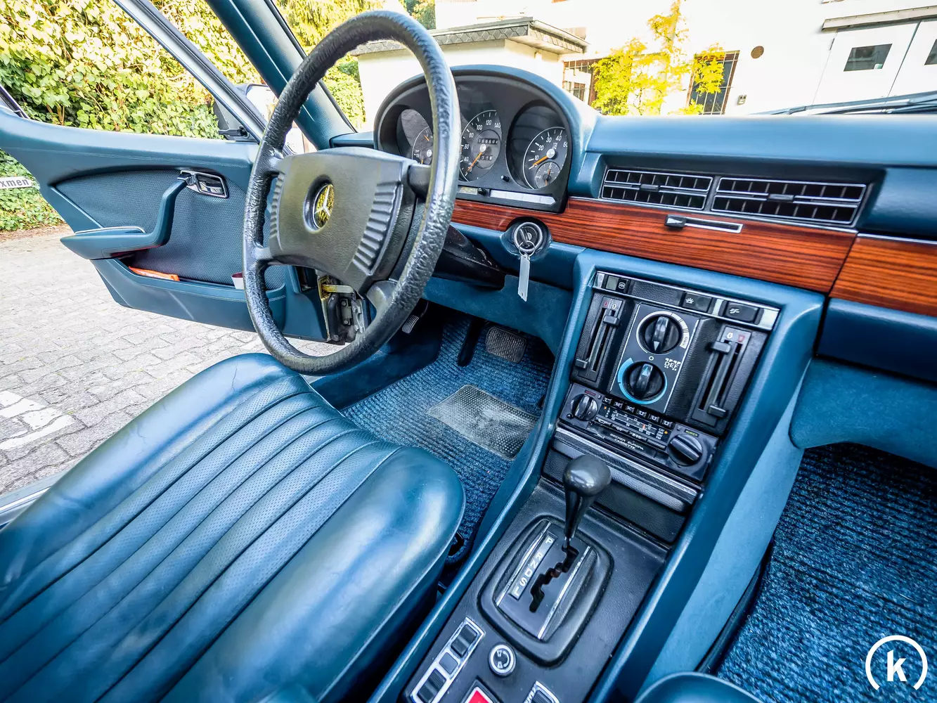 Blue leather seats can be found in the interior of the 450 SEL: the current owner mentions that the interior is almost still original and has almost a perfect condition with only minimal traces of patina. Small damage can be seen in the leather cover on the edges – but these little things are recorded in detail in the picture gallery. The 450 SEL is equipped with a sunroof, power steering, central locking, power windows and air conditioning. With the exception of a non-functioning daily odometer, all control elements such as switches, levers and buttons can be attested to a problem-free function.
