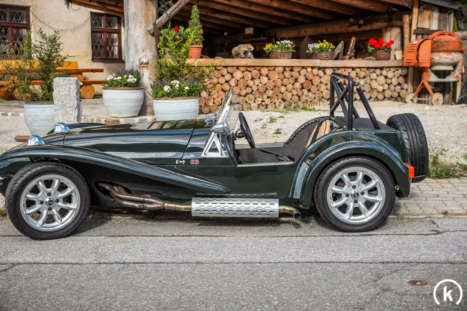 The thoroughbred sports car is painted in "Westfield British Racing Green" and decorated with all sorts of "Team Lotus" emblems. After many years, the paint has smaller cracks and quirks, which can be easily seen in the pictures. On the rear left fender there is a minimal paint defect. However, further defects are not specified or visible. Since the fenders are made of plastic, no rust can occur here as well.