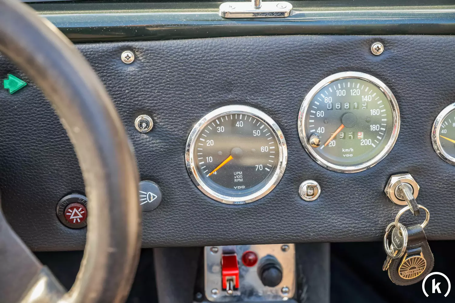 The interior is very puristic, contains only the most important for a sporty driving experience and can be protected by a water-repellent cover, also called a persenning. The seats are made of brown imitation leather and decorated with a black border. As accessories there are side windows and a Weber double carburetor is also part of the equipment. As can be seen in the pictures, the steering wheel has signs of use corresponding to age. Apart from that, the interior is in good condition, defects are not indicated.