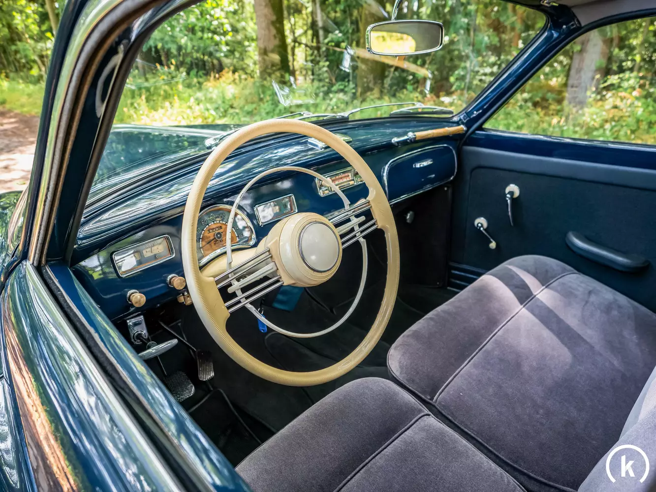The interior of the BMW 501 offers a living room ambience: the thickly upholstered seats allow you to sit comfortably and as a driver you can use a 2-spoke steering wheel in ivory colour with chrome horn ring. The entire interior of this vehicle is extremely well maintained for its age and preserved without damage. A special feature is the blue folding roof, which has no cracks and can be opened and closed perfectly. Furthermore, a contemporary radio can be discovered in the interior, which also works without any problems. Currently, however, the radio is not connected, the new radio antenna is located in the trunk and can be installed by the new owner, in a suitable place for him. incidentally, all switches, levers and buttons inside the BMW 501 are said to function flawlessly.