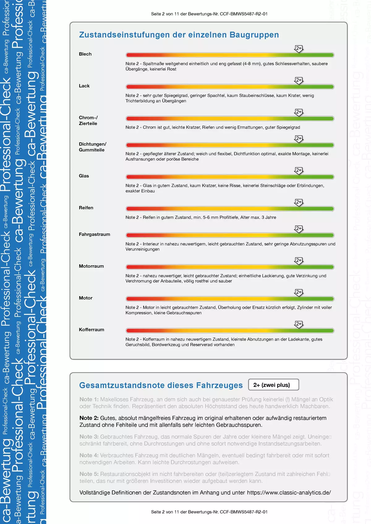 Guten Tag, das Gutachten (die Besichtigung) wurde im letzen Monat von dem TÜV Nord durchgeführt. Auf Grund der Besichtigung durch den TüV Prüfer hat dieser den Zustand 2+ fest gestellt. Der TüV Nord arbeitet wegen der Wertermittlung mit der classic-analytics zusammen.