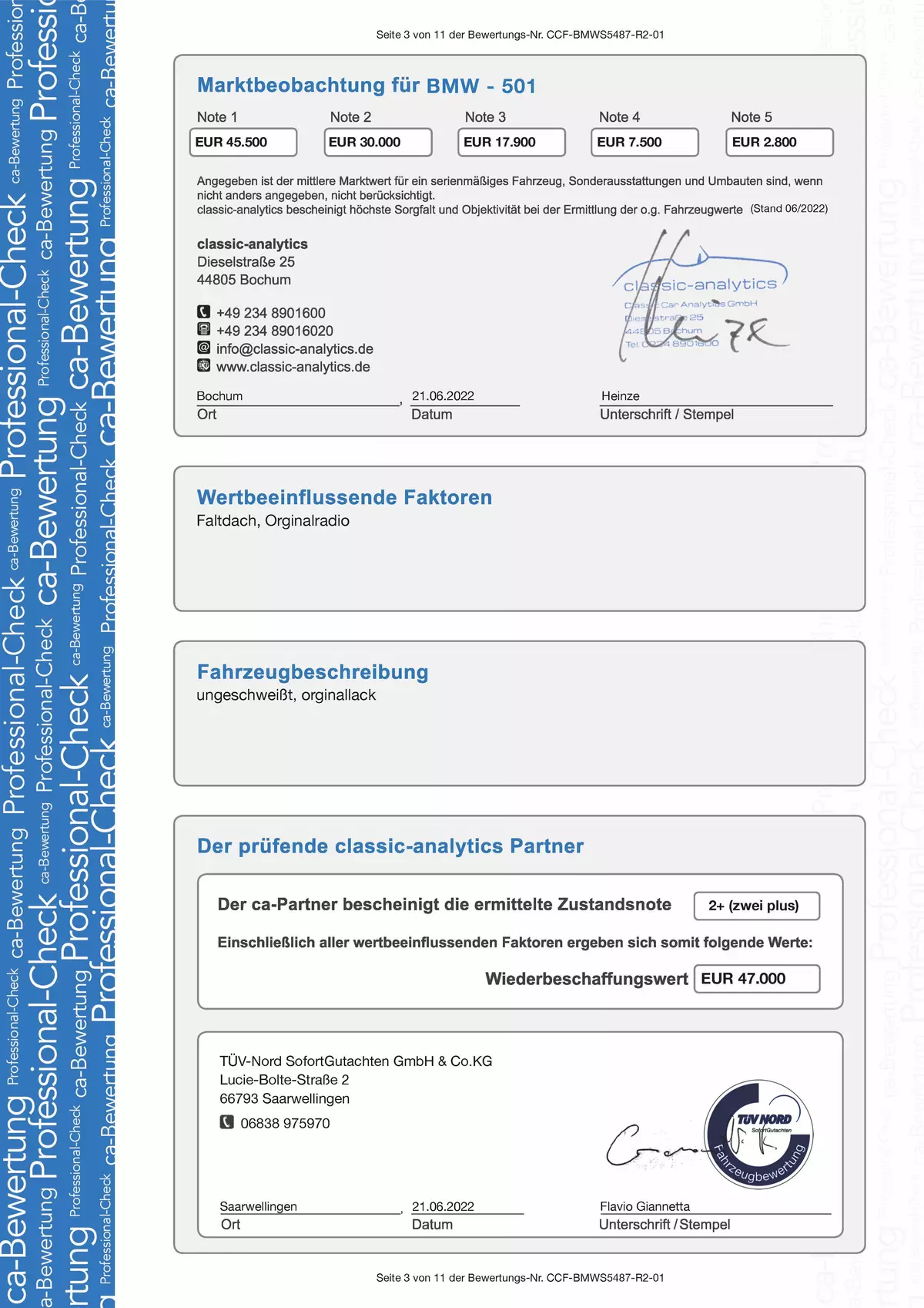 Guten Tag, das Gutachten (die Besichtigung) wurde im letzen Monat von dem TÜV Nord durchgeführt. Auf Grund der Besichtigung durch den TüV Prüfer hat dieser den Zustand 2+ fest gestellt. Der TüV Nord arbeitet wegen der Wertermittlung mit der classic-analytics zusammen.