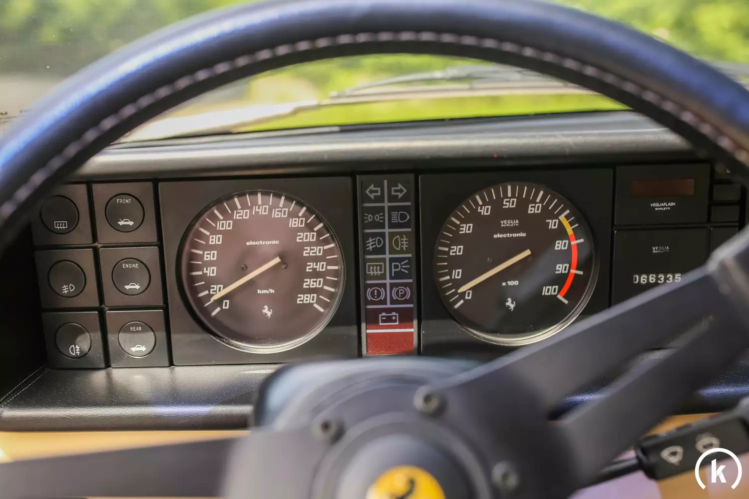 In addition to the Veglia round instruments in the dashboard, the Ferrari's speedometer is housed in its own version: 66,335 kilometers can be read on it. Through various cancelled invoices and various TÜV reports of the previous years, the total mileage can be almost traced.