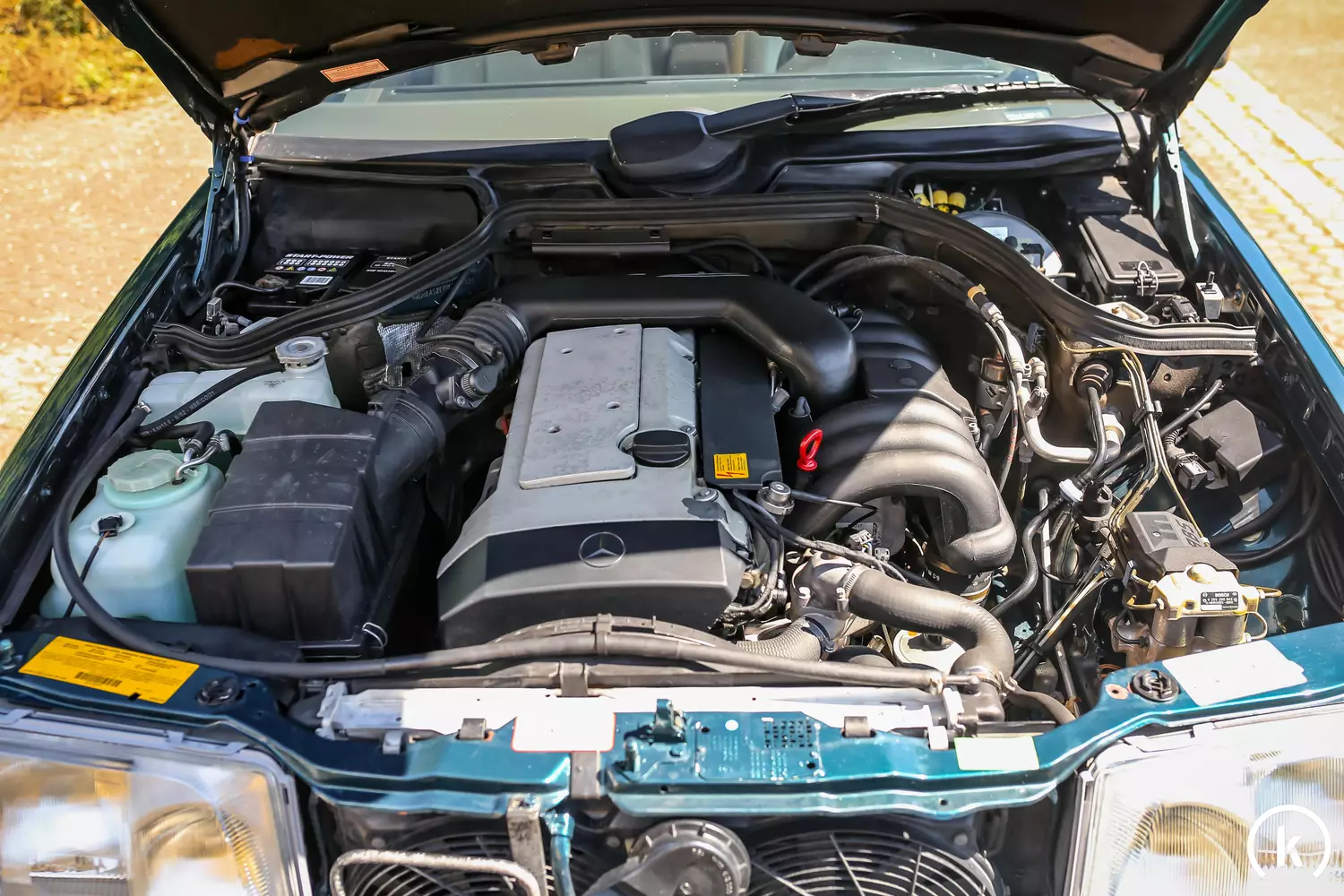 Light leather, which has some age-related patina, can be taken from the interior of this Mercedes-Benz. The beige interior harmonises very well with the outer colour in tourmaline green metallic and provides a great sense of space inside this E 320 due to the light colour. The equipment of the coupé reads extremely rich – according to the optional equipment codes, the E 320 was equipped with the following features ex works: seats electrically adjustable on both sides, airbag for front passenger, storage box in the centre console at the front, storage box at the rear, 3rd brake light, electric sunroof with lifting device, head restraints in the rear, cruise control, steering column electrically adjustable, sun visor with make-up mirror illuminated left and right, Burglary and theft warning system (EDW), automatic climate control, thermally insulating glass all around, heated rear window, headlight cleaning system, sound system and a Mercedes-Benz Exquisit cassette radio. Common to all equipment features is their flawless functioning.