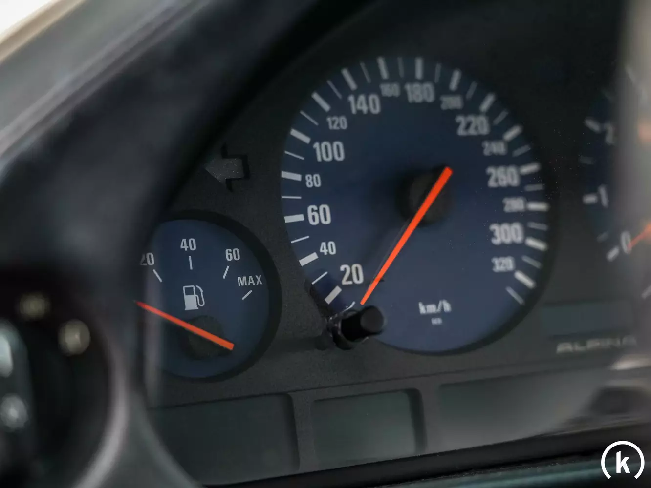 The equipment can be read from the original order form. The round instruments are highlighted in blue, and hands coloured in red provide a sporty attitude: this Alpina B12 has covered 198,100 kilometres since its delivery. The mileage seems credible due to the general condition.