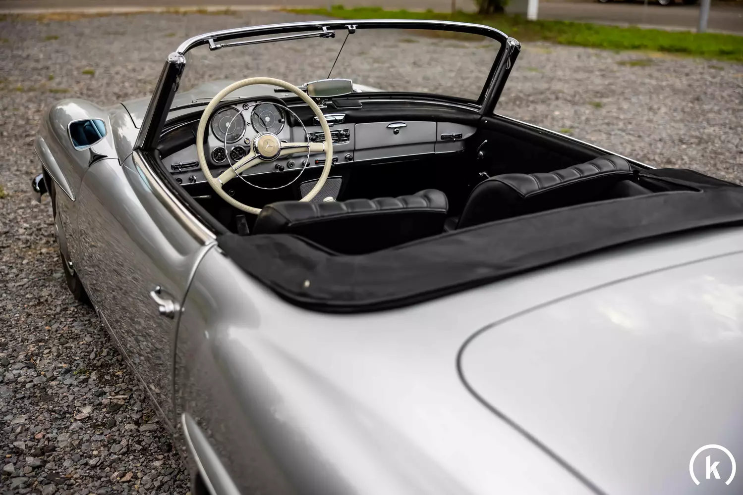 Black leather can be found in the interior of the 190 SL: the ivory-coloured steering wheel, which is well integrated into the interior of the Mercedes-Benz in terms of colour, is particularly striking. Although a few traces of use can be detected, there is no damage or even missing parts inside this roadster to complain about. The soft top mechanism works perfectly – the fabric soft top of the 190 SL can be easily opened and closed again. A tarpaulin is in good condition and reinforces the elegant appearance of the roadster when driving open. Features include a radio and the transverse seat.