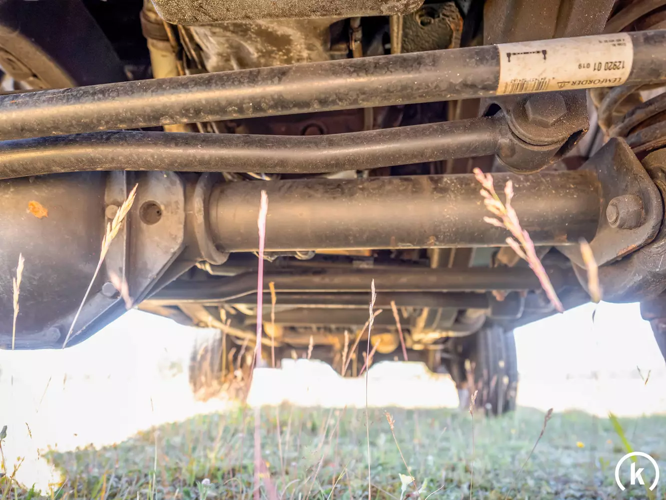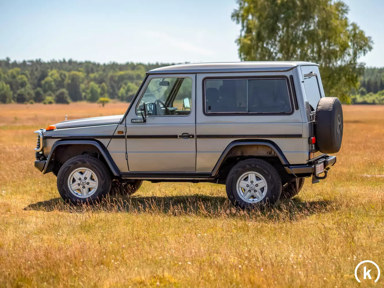 If you look at the side of the G-Class, you can see the original standard rims mounted on the large tires. The tyres are as good as new, so that the vehicle is immediately ready for use. Whether like here in the Lüneburg Heath, or on a safari in Kenya. Get in, drive off, enjoy. The necessary deceleration is ensured by the brakes, which are also as good as new. Another extra is the front protection bar.