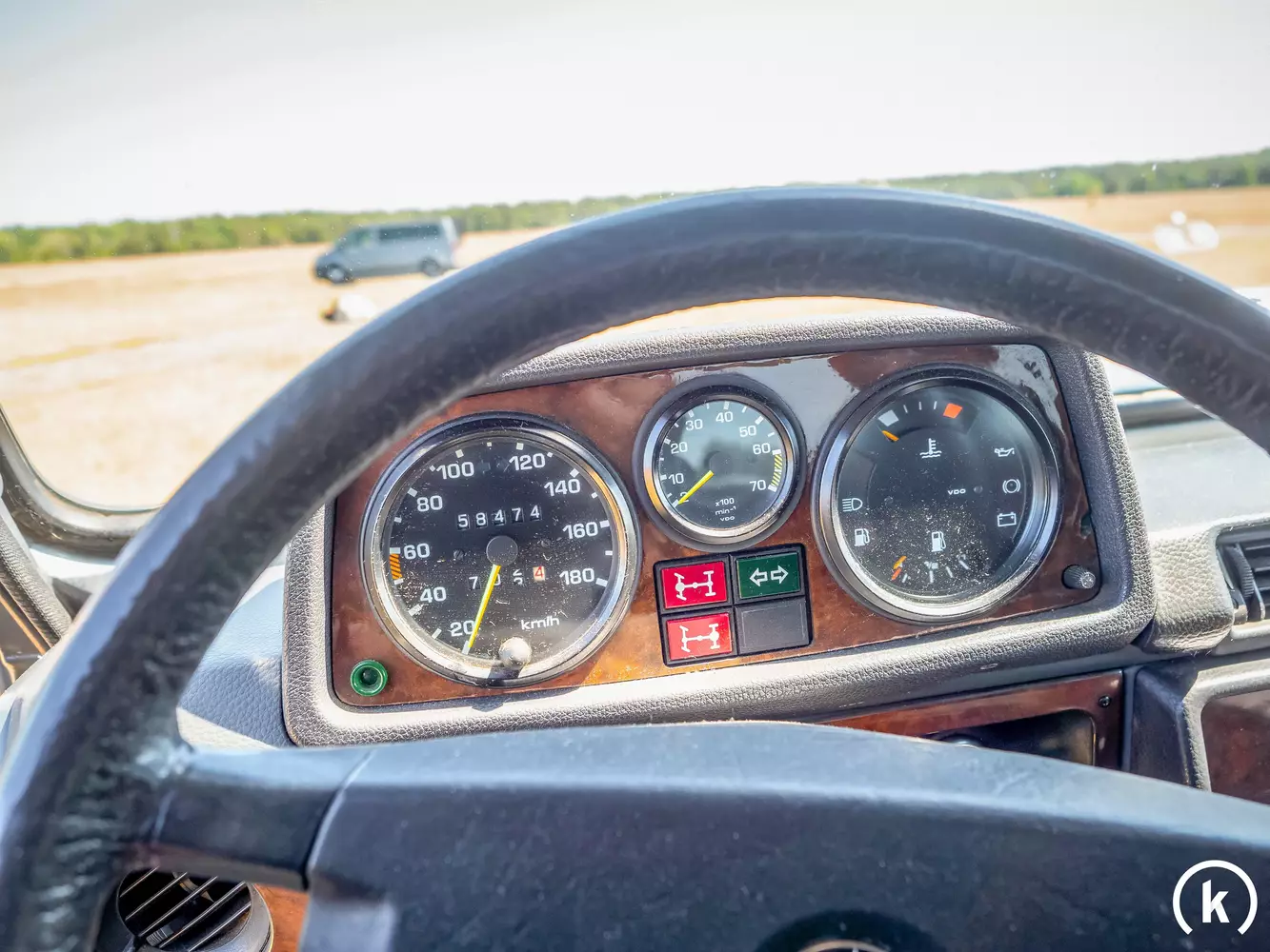 The instrument panel is tidy and clearly arranged. The instruments, which originally came from the truck department, all work flawlessly and fulfill their function. 58,474 kilometers are read, which seem quite credible. In addition, there is a history of this G-Class.