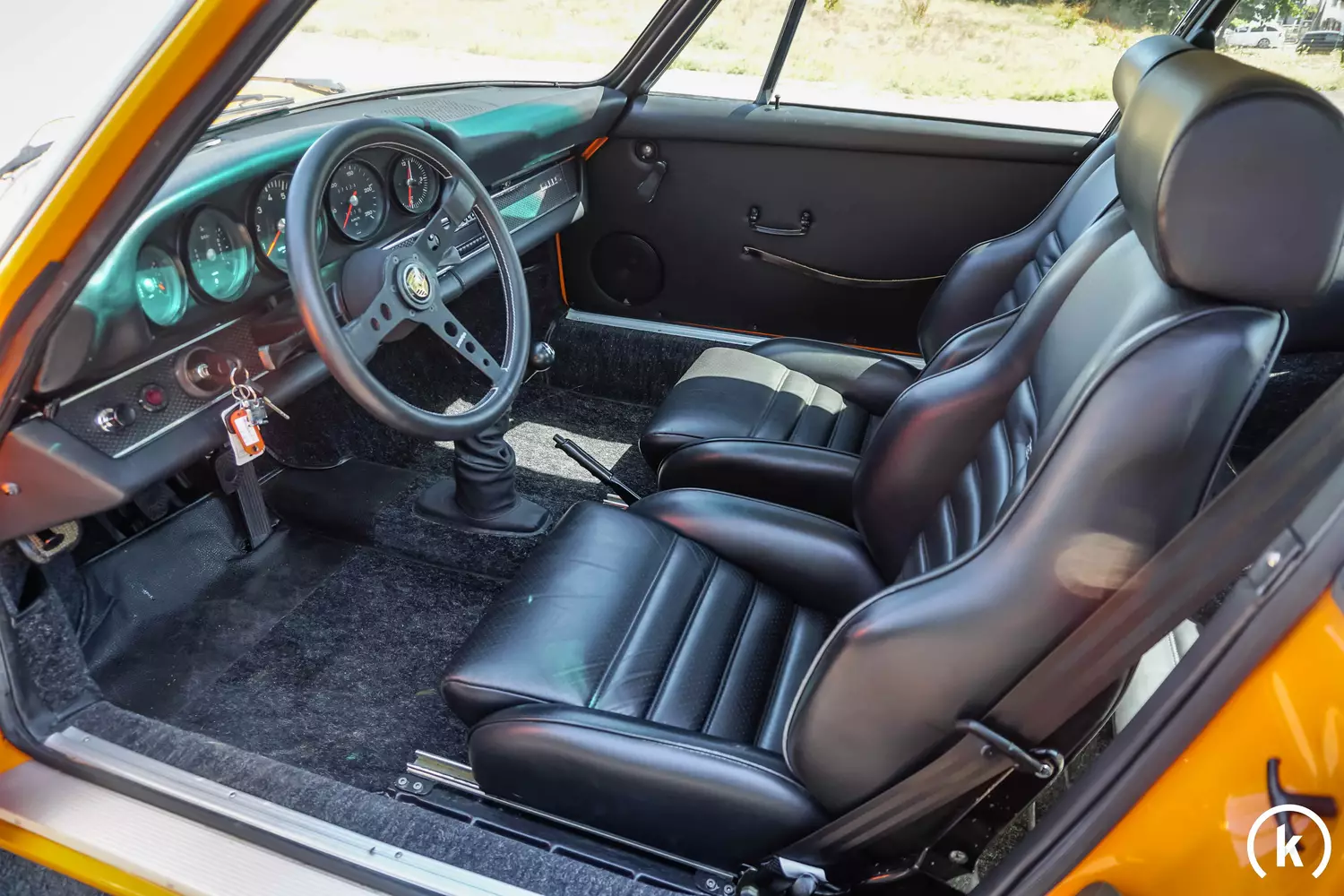 In the interior there are black full leather sports seats from the manufacturer Recaro with thickly upholstered side bolsters, in the whole the interior impresses with its well-kept state of preservation. Damage or wear and tear cannot be found anywhere. Next to the Becker Mexico Pro Radio is a perforated 3-spoke leather steering wheel in this Porsche 911 S. The windows can be opened by manual window cranks and the door panels are only marginally equipped. Jacks and a full tool bag can be found under the bonnet of this Porsche.