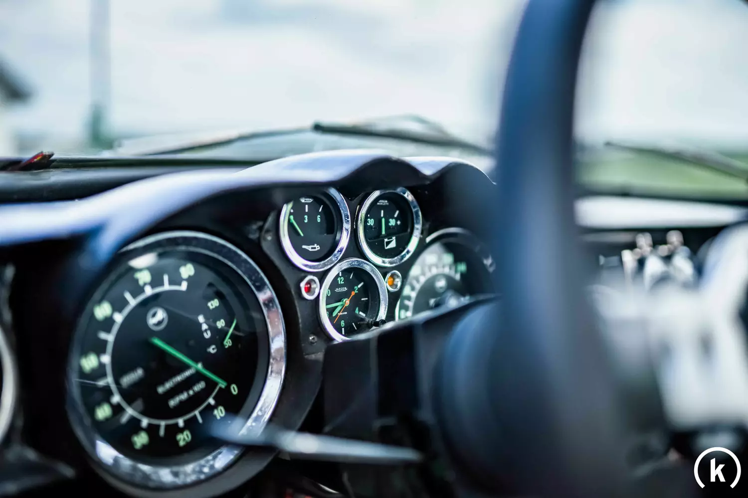A chrome-mounted dashboard armada with green indicators can be seen in the driver's cockpit: the 5-digit speedometer has a mileage of 86,500. According to the current owner, the total mileage of the Alpine can be approximated by various invoices and former TÜV reports. All instruments in the interior can be attributed a flawless function.
