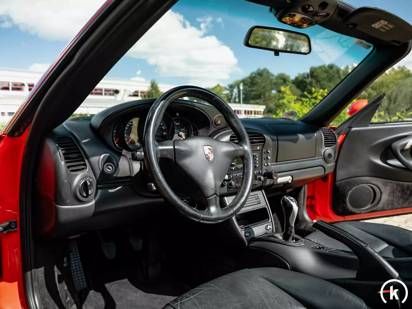Classic black leather can be found in the interior of the Porsche 996 Convertible: The current owner mentions that there is a small hole in the rear right seat shell, but the interior can be found in a well-preserved condition corresponding to the mileage except for this defect. On the sun visors, the covers for the interior mirrors have been removed by the previous owner. It is also worth mentioning that the soft top hydraulics work, but according to the seller needs some oil. On board this Porsche 996 Cabriolet are the following features: power steering, central locking, electric windows, heated seats, ABS, air conditioning, cruise control and a Porsche original radio.