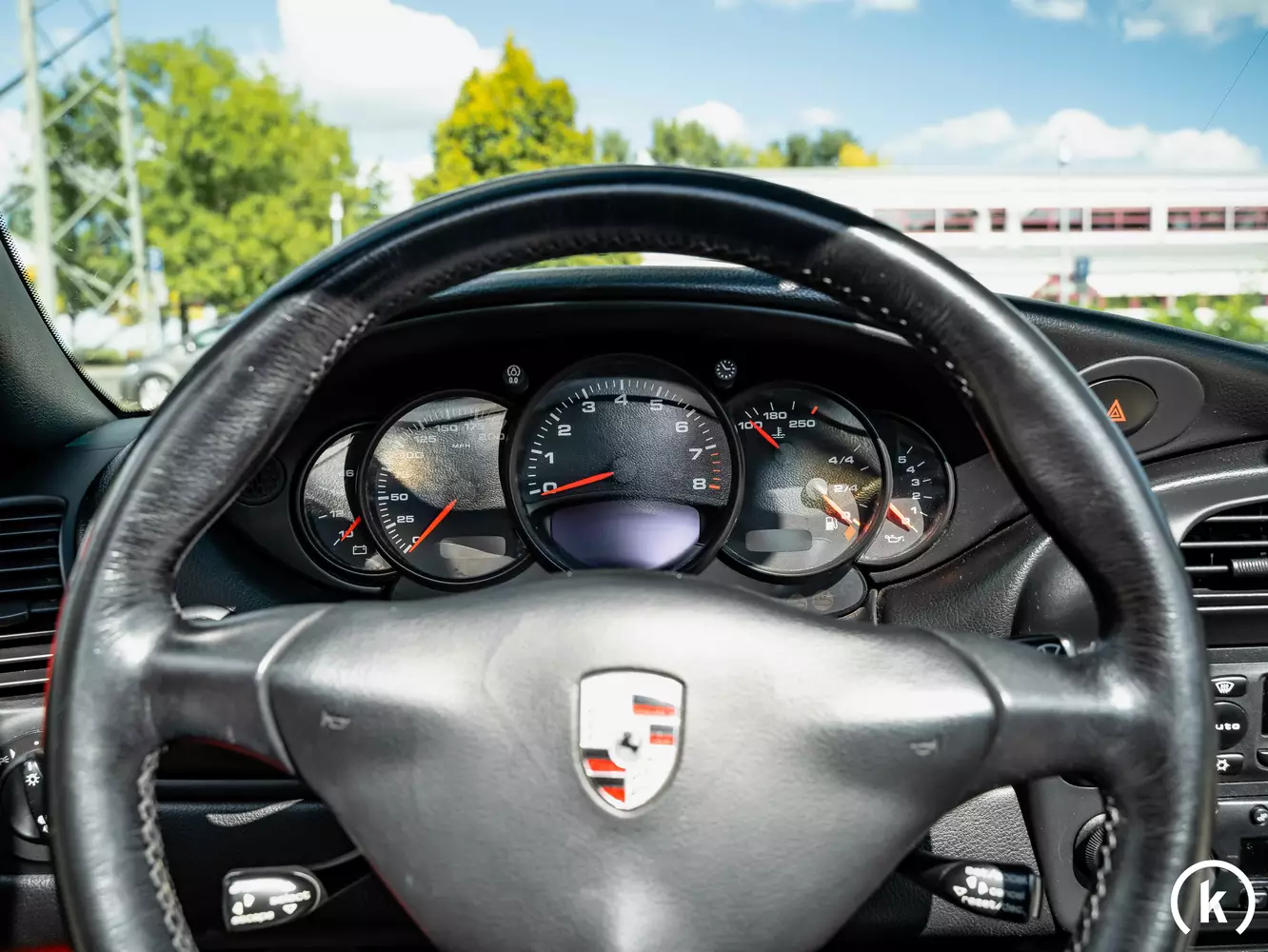 6 slightly nested instruments contain important information in the driver's cockpit. The digital speedometer shows a read mileage of 159,000 kilometers, the total mileage of the 996 Convertible is not verifiable due to the missing checkbook, but the mileage can be described as credible at the sight of the body condition and with regard to the technical condition. Since the speedometer is still original, the analog instruments are still available as mileage display, the digital speedometer has been converted to KM After consultation with the current owner, all buttons, switches and levers are working properly.