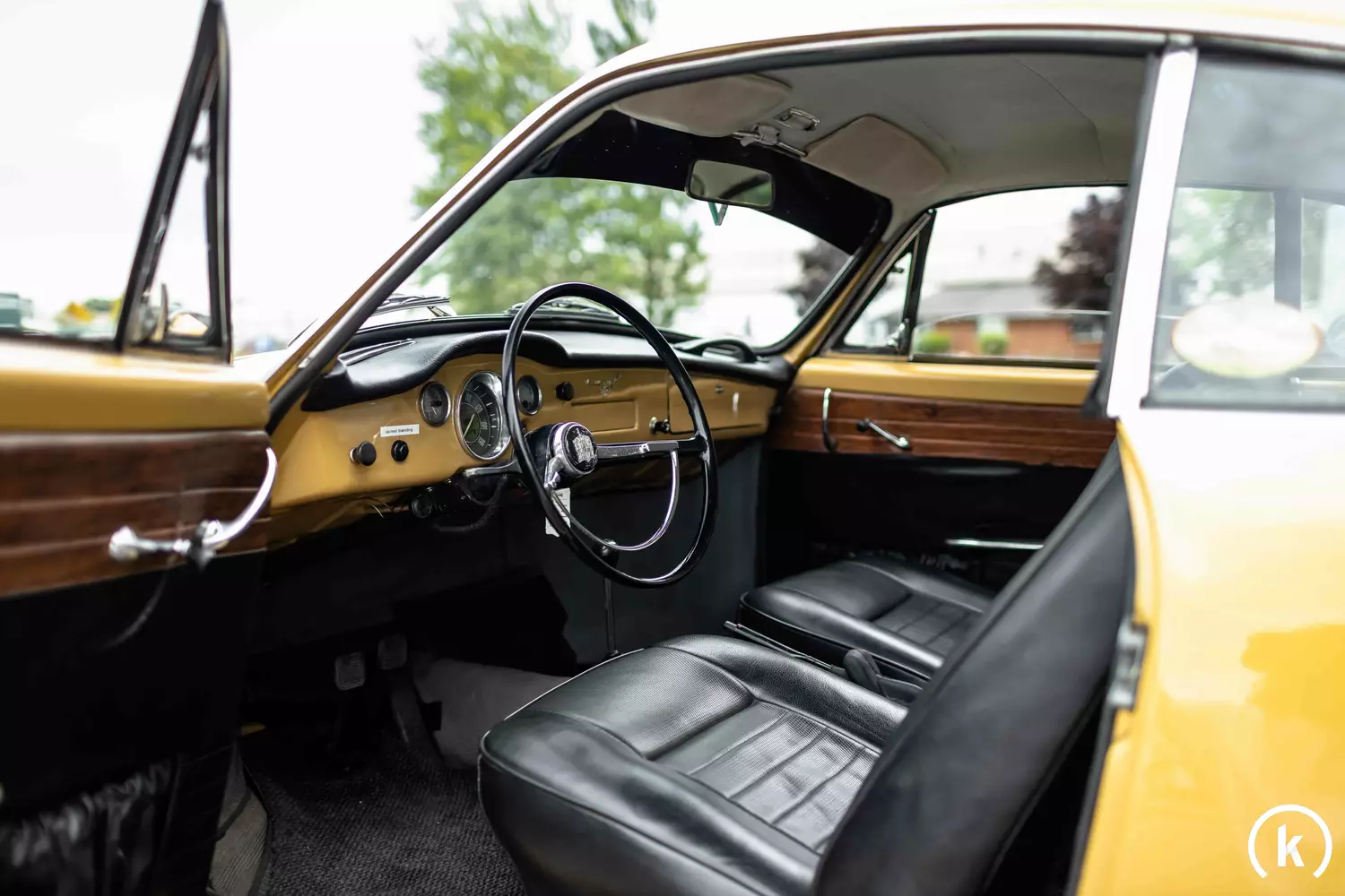 Accident-free and in good condition, the exterior of the yellow VW Karmann-Ghia presents itself according to statements of the seller. The current owner informs that this coupe was repainted years ago, the current paint condition can be classified as good, the body has no rust. All chrome décor on the vehicle is still in brilliant condition, the thick bumpers and the large turn signals are a good state of preservation. Also worth mentioning is the modification-free state.