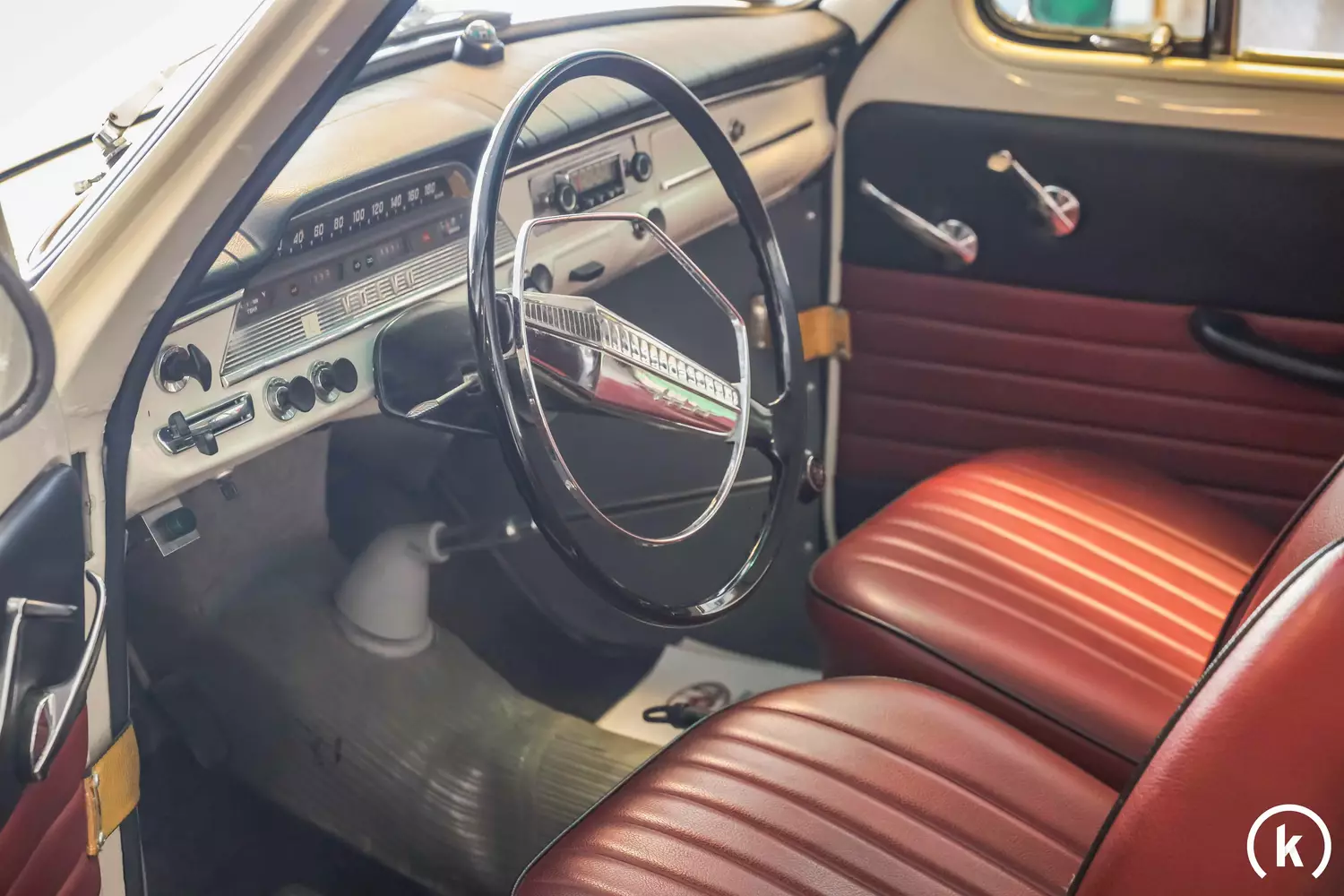 The characterfully shaped rear section gave the car its nickname "Humpback Volvo". According to the badge in the engine compartment, this PV 544 was delivered in the color "Pearl White" (color code 79) – over the years, a repainting has already taken place. The general condition of the exterior of this Volvo is well preserved for its age of 58 years: Strong rust traces or missing parts on the body are not recognizable – all chrome attachments are also a well-preserved condition. On the windscreen you can see a rockfall and in a slight parking damage the left fender was already involved.
