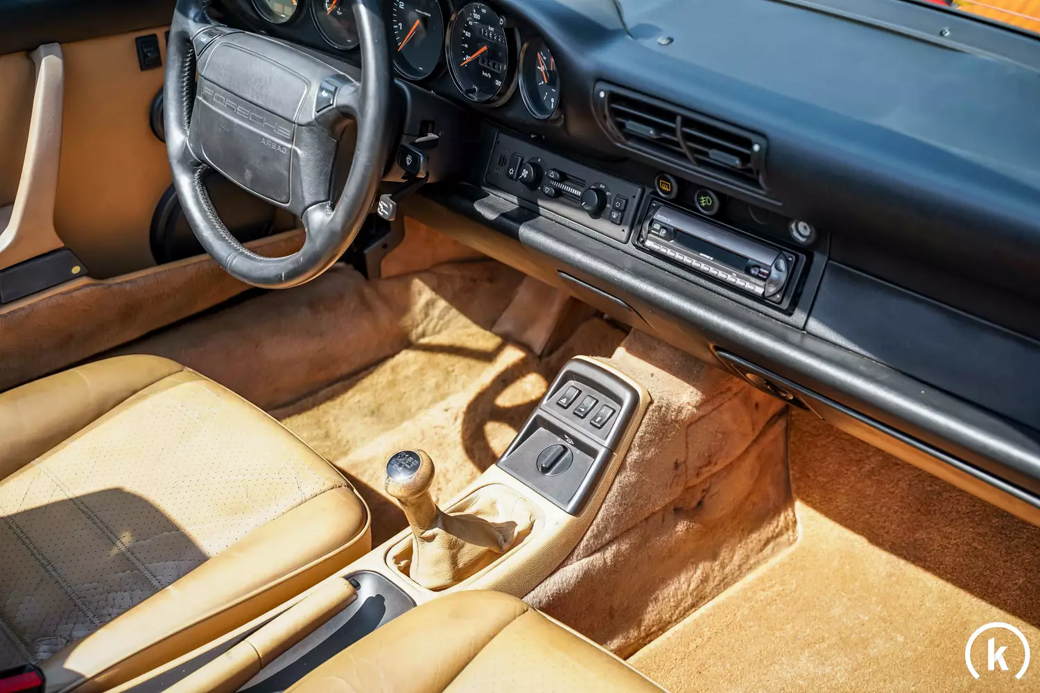 Full leather seats in beige colour – which are somewhat faded and worn out – can be seen in the interior of the 964 Cabriolet. Especially the leather on the driver's seat is porous in some places. Although the entire interior can be attested to a condition corresponding to the mileage, but all interior parts are present and consequently no missing parts are listed. Features include power steering, central locking, power windows, electric seats, heated seats, cruise control and a Sony accessory radio on board this 911. The function of the soft top as well as all control elements in the interior is flawless.