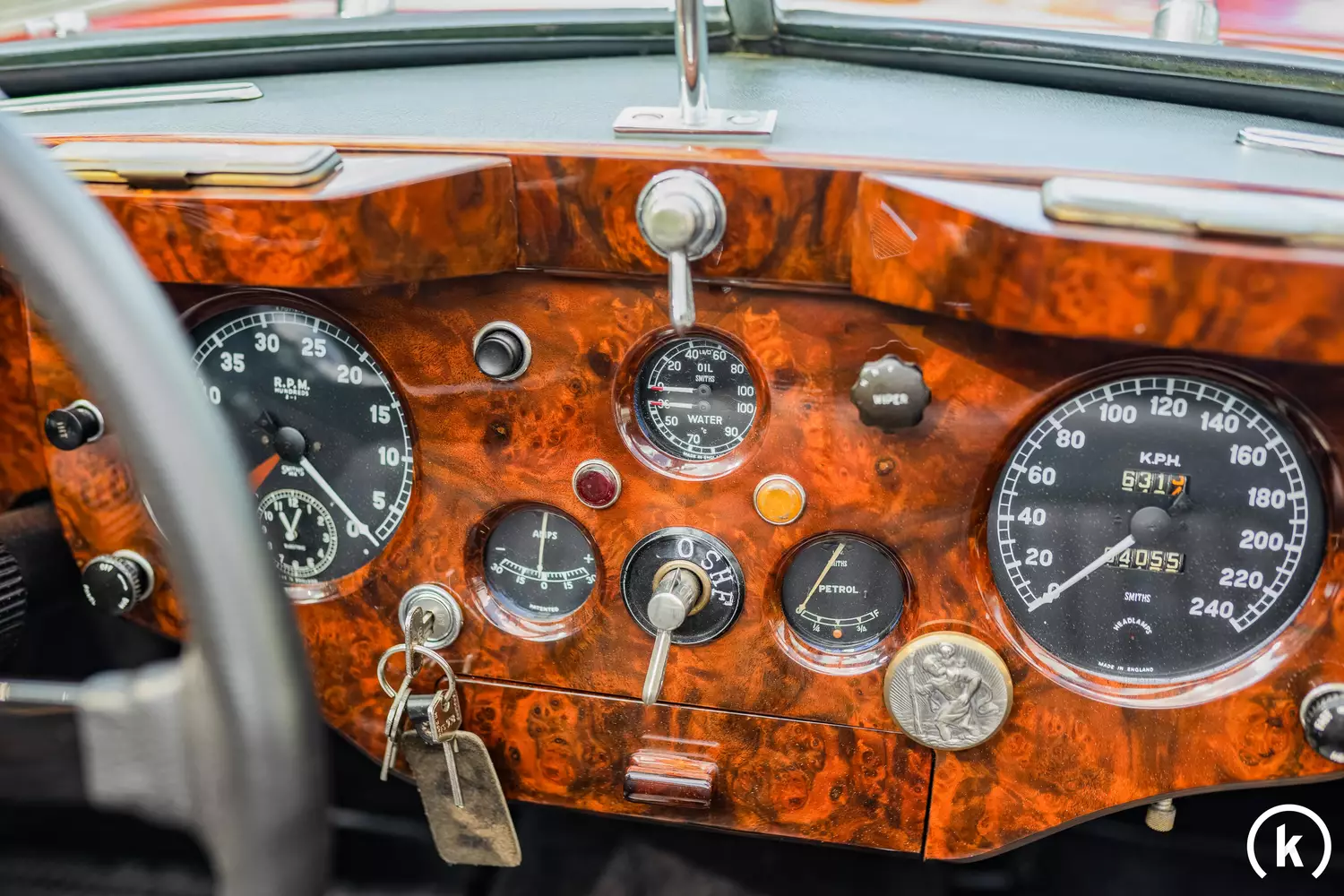 On the beautiful instrument panel of this Jaguar, a mileage of 4,055 kilometers can be read off the speedometer on the 5-digit speedometer. All the displays and controls inside the XK 140 work perfectly.