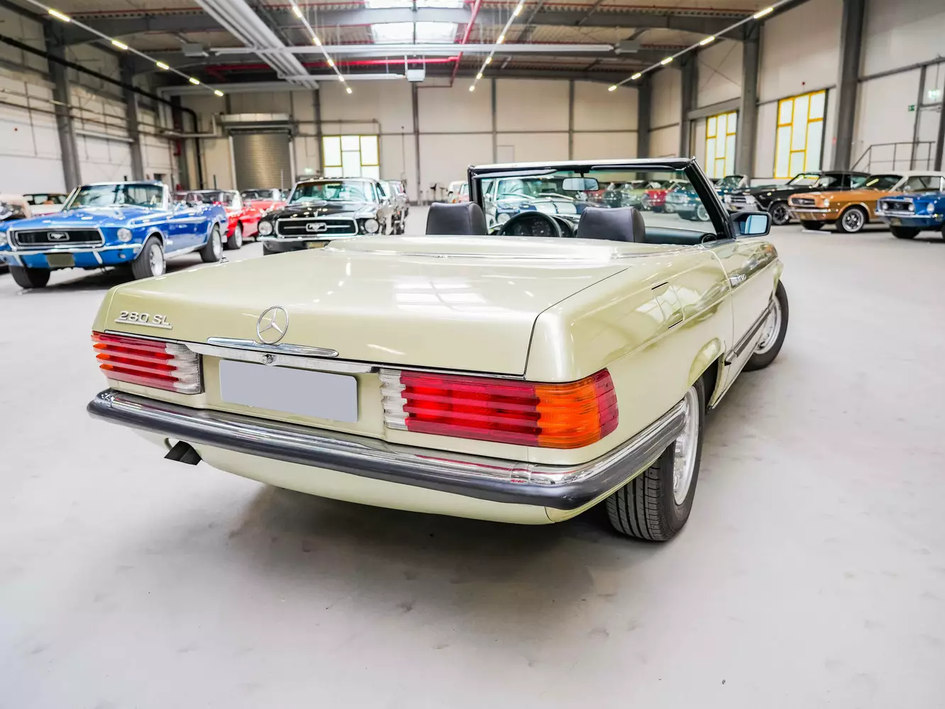 Mercedes-Benz calls the colour scheme in which the body of the SL 280 presents itself "silver thistle green". According to the seller, the paint was already renewed a few years ago. Thanks to the Californian sun, the body is in a carefree overall condition, and shows only some age-related signs of use. For example, some stone chips can be removed from the paintwork, and there are minor scratches on bumpers and door edges. True to the motto "best of both worlds", the roadster can score with an apparently rust-free condition due to its Californian past, and is still largely in original EU design. The bumpers are also the EU variant, whose lush chrome applications have not lost their shine even after 35 years. As a roadster, the SL 280 comes in true style with a fabric top, which was recently renewed