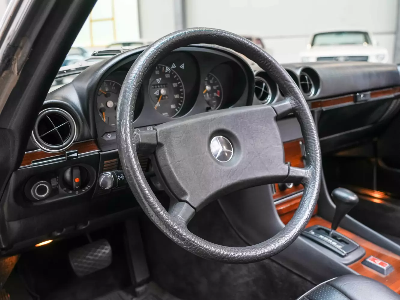 In addition to the leather-covered seats, the interior of the roadster is equipped with the characteristic "MB-Tex" covers. The interior, including chrome trim, wood panelling and leather upholstery, looks very well maintained and shows hardly any signs of wear. There is no UV damage to both the dashboard and the wooden applications, and the driver's and front passenger's seats have also apparently enjoyed the best care over the past 35 years. In addition to the built-in automatic transmission, an air conditioning system is part of the optional equipment of the SL, which, according to the seller, should be filled with new coolant.