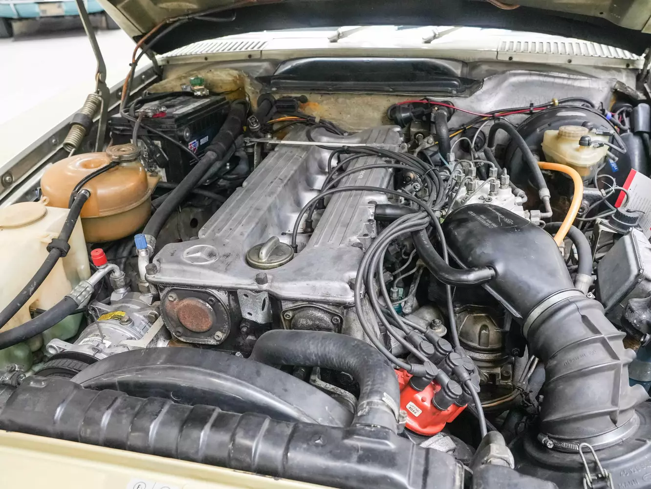 In addition to the leather-covered seats, the interior of the roadster is equipped with the characteristic "MB-Tex" covers. The interior, including chrome trim, wood panelling and leather upholstery, looks very well maintained and shows hardly any signs of wear. There is no UV damage to both the dashboard and the wooden applications, and the driver's and front passenger's seats have also apparently enjoyed the best care over the past 35 years. In addition to the built-in automatic transmission, an air conditioning system is part of the optional equipment of the SL, which, according to the seller, should be filled with new coolant.