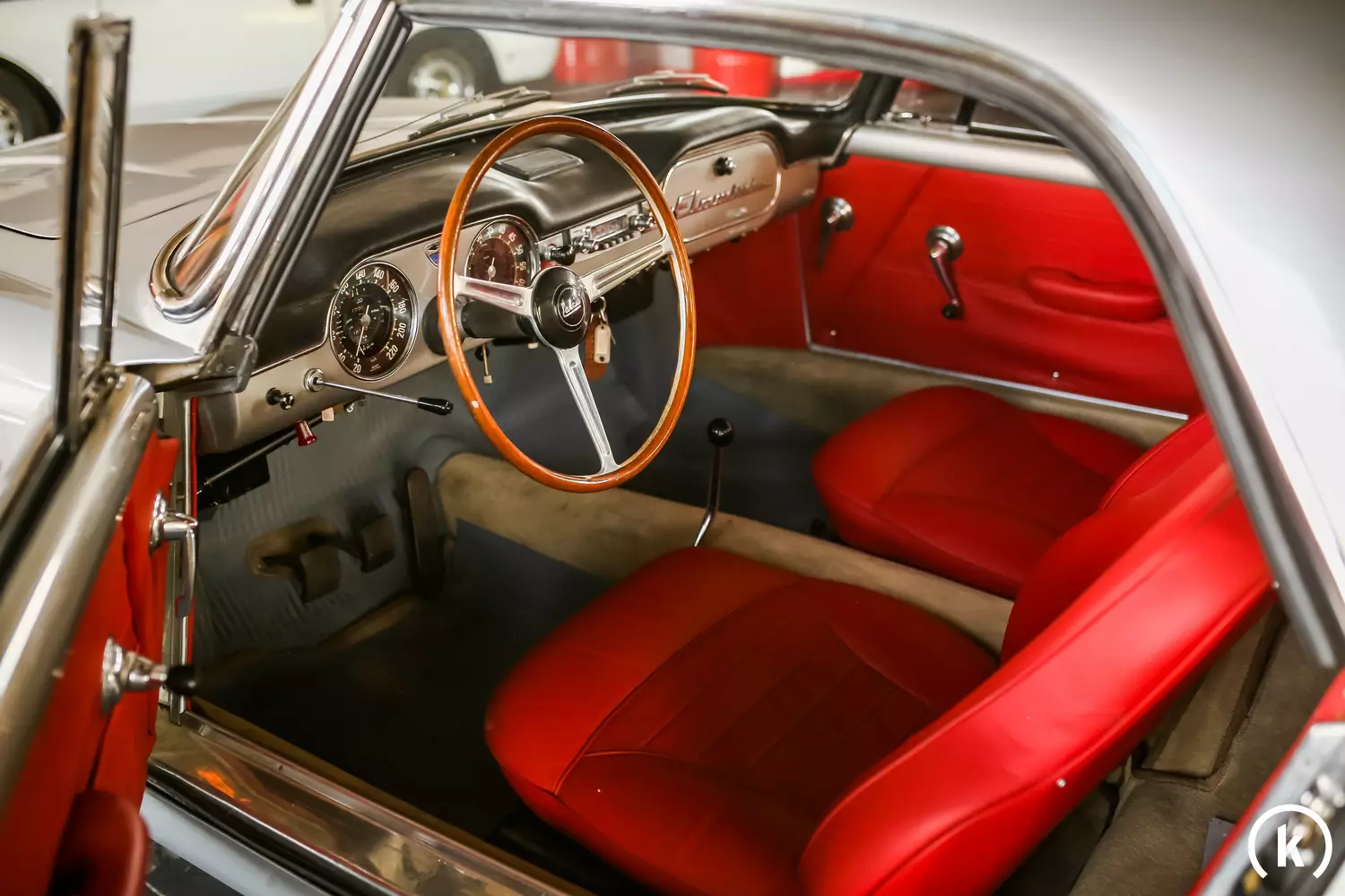 Im Fahrzeuginneren sind luxuriöse rote Ledersessel verbaut, die das ursprüngliche Interieur ersetzen. Ebenso wurde der Bezug der Türeninnenseite erneuert, während der Fußraum wie der Himmel im originalen Zustand belassen wurde und sich entsprechend seinem Alter mit einigen Gebrauchsspuren präsentiert. Das Cockpit ist ebenfalls original und in einem guten Zustand, auffällig ist das elegante Edelholzlenkrad und die zum Teil silberfarben verblendeten Armaturen. Die Anzeigen sind im eleganten schwarz konzipiert, neben dem auffälligen Handschuhfach und einem zum Interieur passenden Radio sind keine explizit erwähnenswerten Ausstattungsbestandteile vorhanden.
