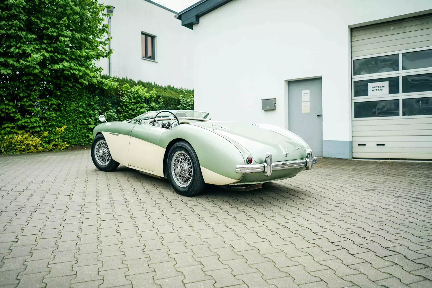 Die British Motor Corporation, auch bekannt als BMC, repräsentierte von 1952 bis 1968 im wesentlichen die Automobilindustrie Englands. Unter den Markennamen Morris, Austin, MG und eben Austin-Healey produzierte das Unternehmen, als größter britischer Fahrzeughersteller, seine Fahrzeuge. Der Austin-Healey 100 (interne Bezeichnung BN1) wurde als Roadster von 1953 bis 1959 produziert. Die Modellbezeichnung “100” erhielt der Sportwagen aufgrund der Höchstgeschwindigkeit von konstanten 100 Meilen in der Stunde, die zur damaligen Zeit von nur sehr wenigen Fahrzeugen erreicht wurde.