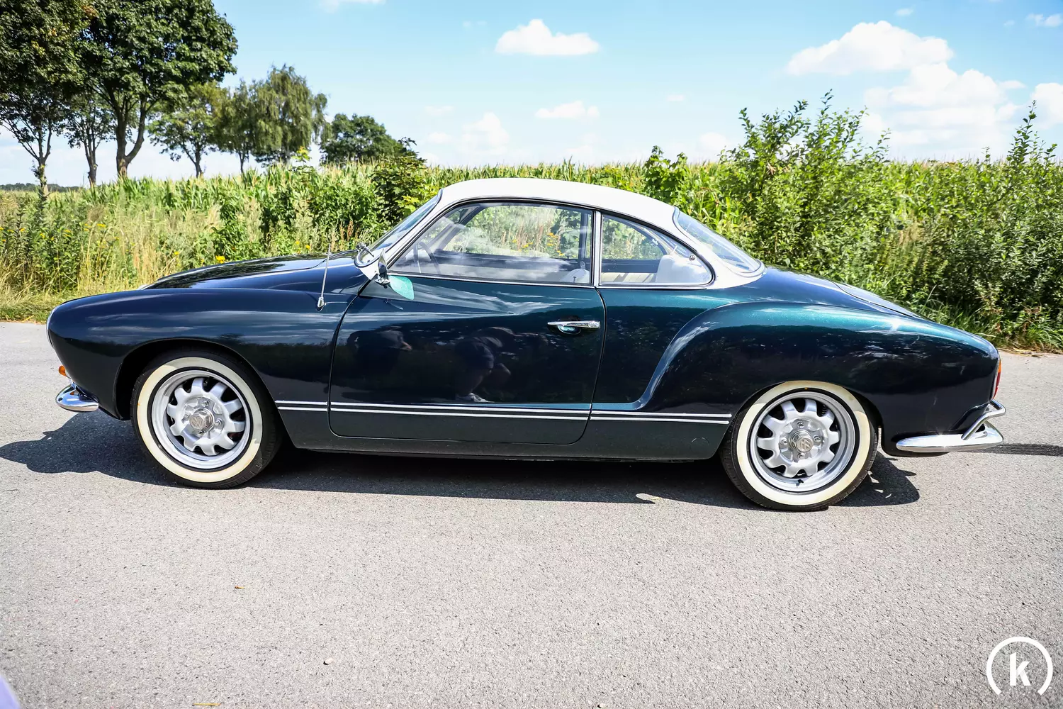 Vor 20 Jahren fand eine Komplettrestauration der Karosserie dieses Karmann-Ghia 1500 statt, 2021 wurde der Wagen dann komplett neu aufgebaut – dabei beliefen sich alleine die Materialrechnungen dem Verkäufer zufolge auf 15.000 €. Im Zuge einer Meisterprüfung eines Lackierers wurde eine vollständige Nachlackierung dieses Wagens im Zweifarb-Design durchgeführt. Nun zeigt sich das Exterieur dieses VW in äußerst gutem Befinden, der dunkelgrüne Karosserielack harmoniert sehr gut mit dem in Beige gehaltenen Dach. Grobe Beschädigungen an der Außenhaut dieses Karmann-Ghia oder gar Korrosionsstellen sind dem Wagen nicht zu entnehmen. Einen Unfall kann der Verkäufer gänzlich ausschließen.