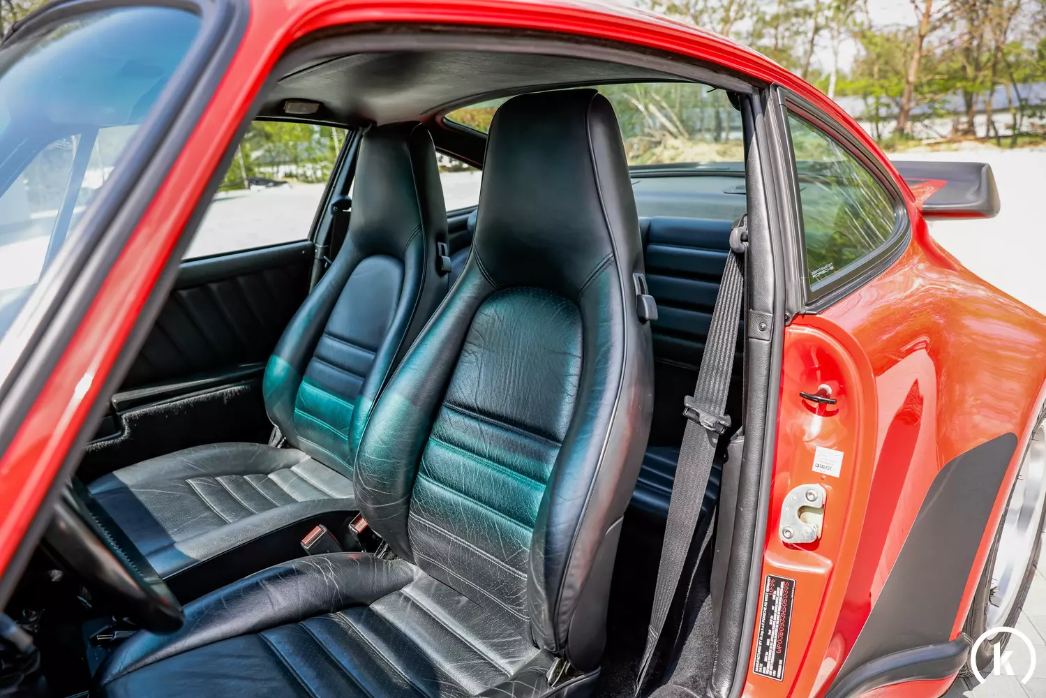 Dem Interieur des Porsche 911 Turbo 3.3 kann genauso wie dem einwandfrei erhaltenen Exterieur keine Beschädigung entnommen werden. Bis auf einen leicht patinierten Fahrersitz können keinerlei Beanstandungen getroffen werden, welche den Gesamteindruck des Innenraumzustandes trüben könnten. Neben den schwarzen Vollledersitzen sind zudem folgende Ausstattungsmerkmale in diesem Turbo präsent: Elektrische Fensterheber, elektrische Sitzverstellung, Klimaanlage. Colorverglasung, beheizbare Heckscheibe, Heckwischer, elektrisches Stahlschiebedach, Nebelscheinwerfer, Scheinwerferreinigungsanlage, elektrische verstellbare Außenspiegel und ein JVC Zubehörradio.
